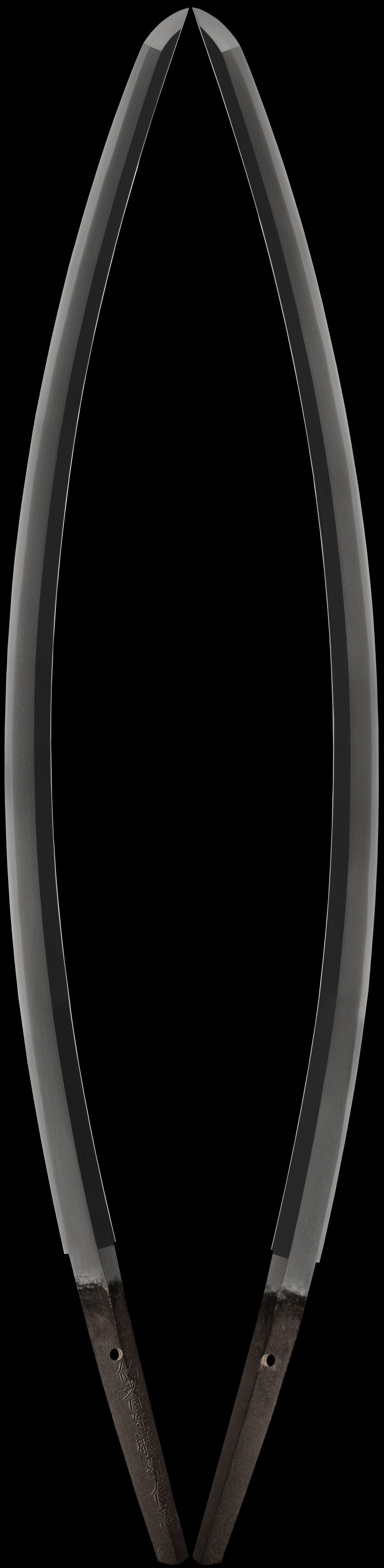 He is called Kawamura H�ki, he received the title of H�ki no Kami in Kan'ei J�nen (1633), and he became a lay priest at the age of 60 in Kanbun Ninen (1662). Because of a large demand during the Kanbun years he produced by working with his son Nobutaka, and for this reason, most of the Nobutaka works commonly seen are works by this second and and third generation. He died in Genroku Ninen (1689) at the age of 87. Hamon is uniform gonome with midare and notare-gokoro majiri, and there is also suguba.