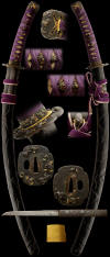 The Koshirae has a deeply carved saya of a large leafy motif. The floral pattern on the fuchi kashira are of mino style. The menuki are foliage and the tsuba are Shi-shi frolicking in foliage also. There are petals on the iron kodzuka with a handforged tempered kodzuka blade. The Sageo and Tsukaito are a brilliant purple that jumps off the mounts and is an eye catcher.