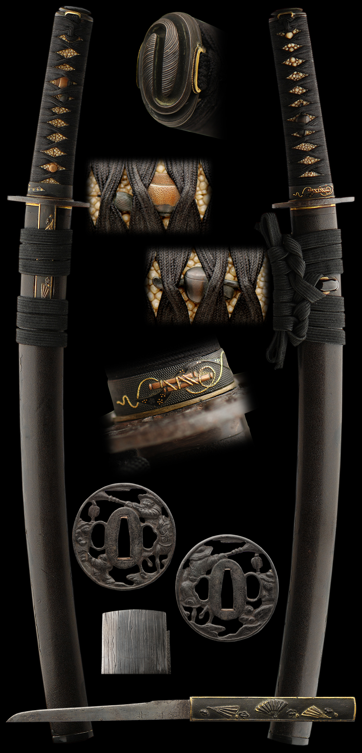This swordcomes with original koshirae adorned in a variety of motifs such as farm implements, fans and tools. The tsuba looks like men making merry!!