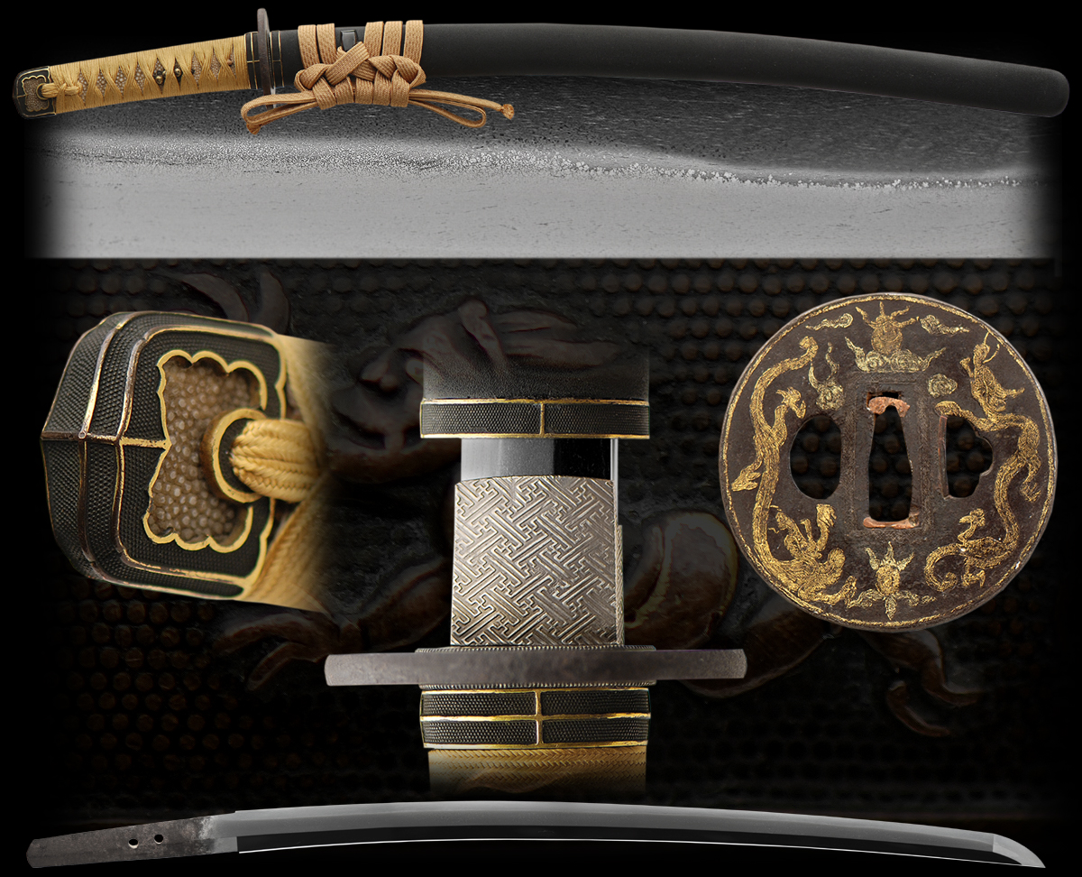 The koshirai is a matching set of handachi inspired fittings. The habaki is silver foiled in a key fret design. The tsuba is iron with gold inlay of water dragons. Many Chinese believed the dragon held, or at least chased, the sun, and many drawings depict this as a flaming red ball. However, over the years, this sun changed color from red to a silvery-pearl color, and gradually the ball came to be considered a flaming pearl, known as the night shining pearl. It is with this that the dragon is almost invariably associated in art.