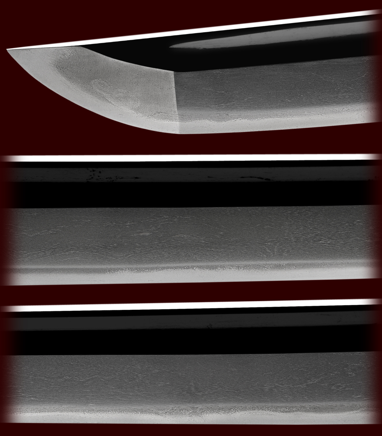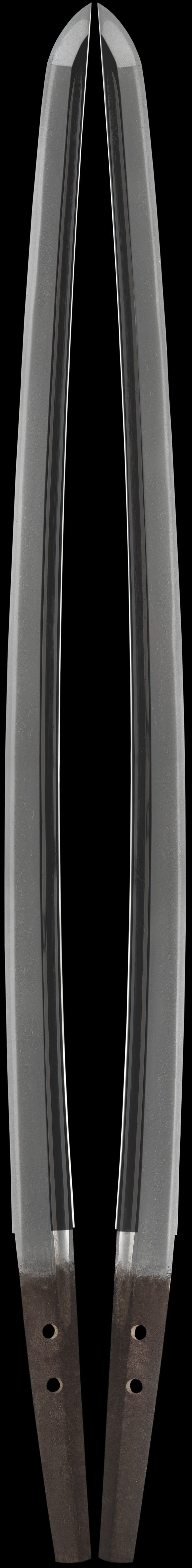 This early sword comes in koshirai and is in a fine polish. The work on this sword is very elegant. In the hamon you can see tsunagashi and kinsuji with a well defined habuchi with some ko-nie to frost the top. The hada is well forged and in good shape for such an old sword with longish wavy masame running here and there entwined with itame and mokume. Ji-nie appears. The style is that of shinogi-zukuri with bohi carved. The tang is suriage and may be koto or Shinto. Niju-ba appears in the boshi and the sword has an old Yamato feel to it.