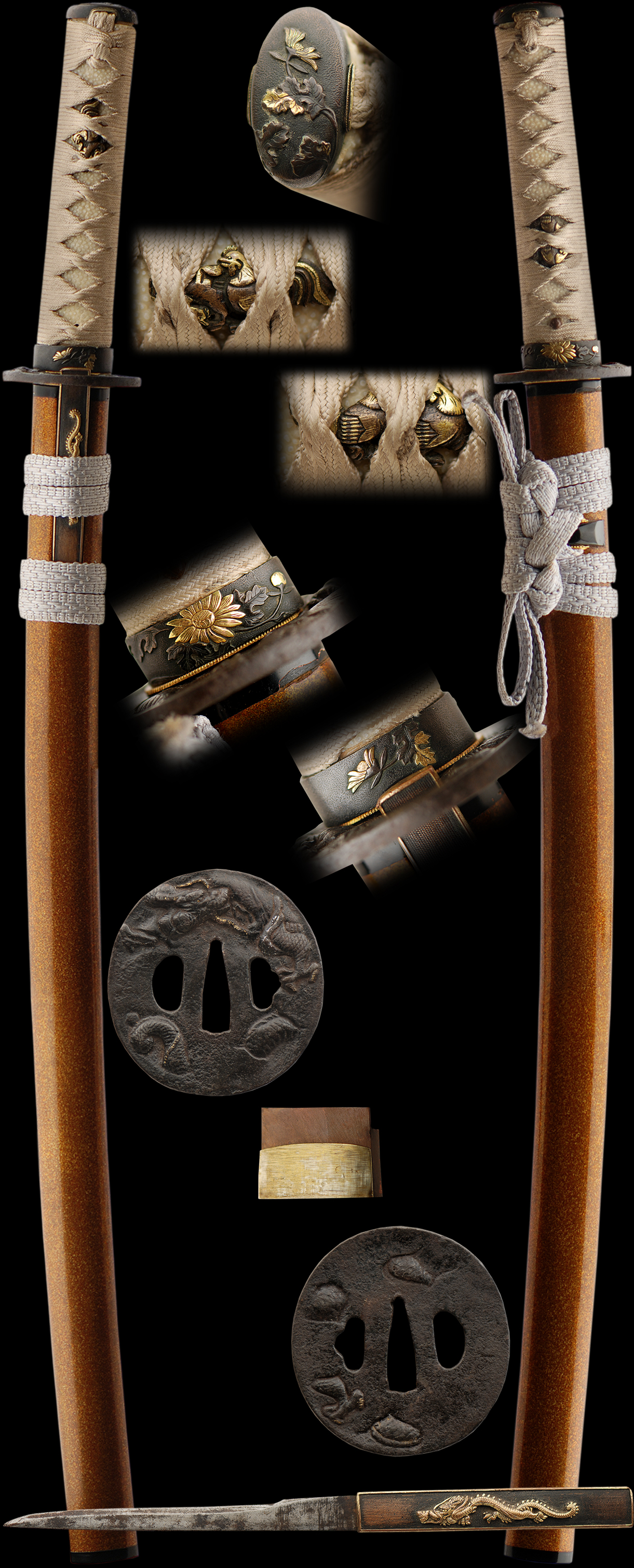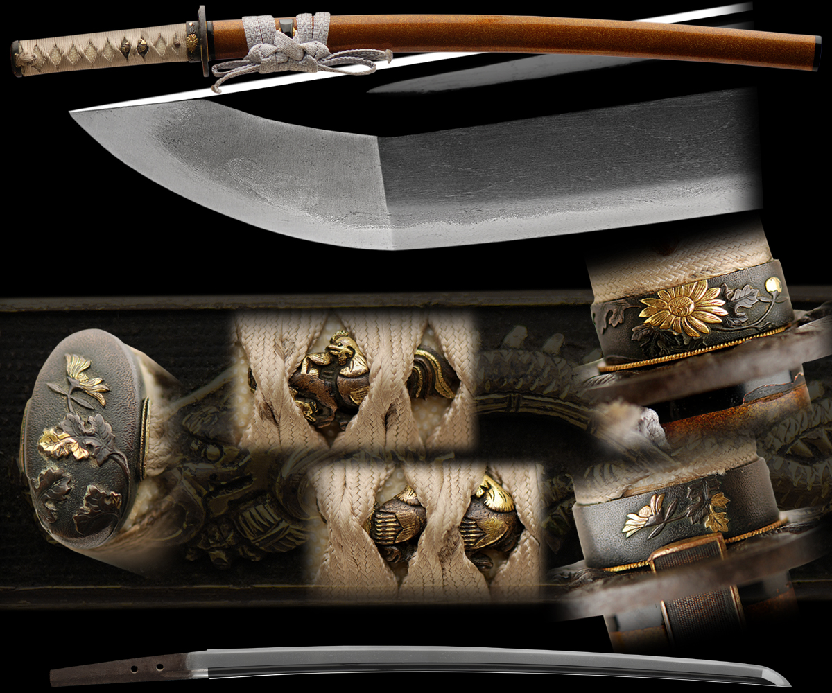 The Rooster is meant to exemplify a number of virtues. The comb symbolizes civil merit whereas the spurs are taken as military merit. The fighting ability of the rooster makes it a symbol of courage whereas its cocking gives it the representation of reliability.The tsuba and kodzuka represent Dragon in waves or clouds motif. The fuchi kashira are very nice quality of a flower and leaf motif with gold finishes. An off white tsuka ito and sageo delightfully contrasts with the gold suspended lacquer finish of the saya. This blade should be submitted to shinsa in the future.