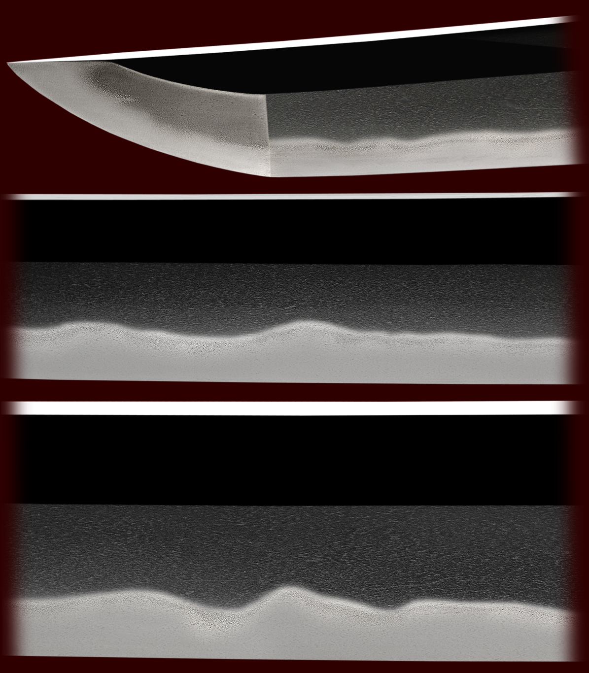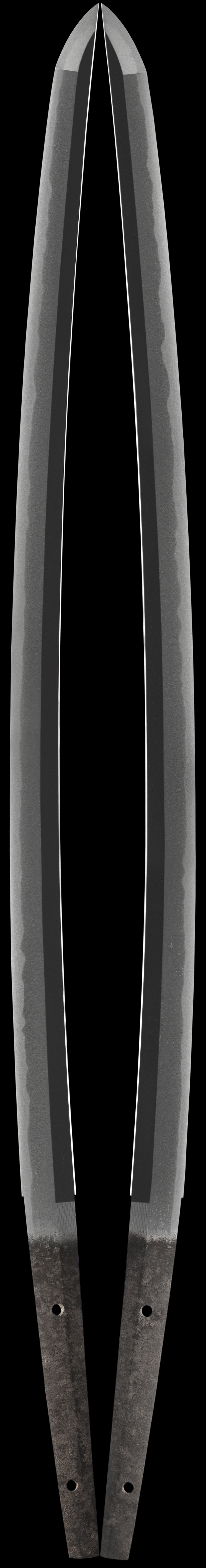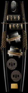 The sword still retains the deep curvature and elegance of its original sugata. Once a much longer sword these blades were sometimes shortened to the Uchikatana style and size due to the one handed style that was in vogue during the latter portion of the Koto period. The Jitetsu is of a beautiful tight itame mokume mix and utsuri appears. Ji-nie abounds in the hada and causes the blade to have a moistness to the finish. this is found in the best of old swords. The hamon is a subtle variety of notare with gunome mix which gives one the feel of gently rolling waves. there is a misty nioi with ko-nie that reflects off the surface of the hamon. The Kissaki is longish and of a midare komi finish. The quality of the steel will provide hours of enjoyment and study.