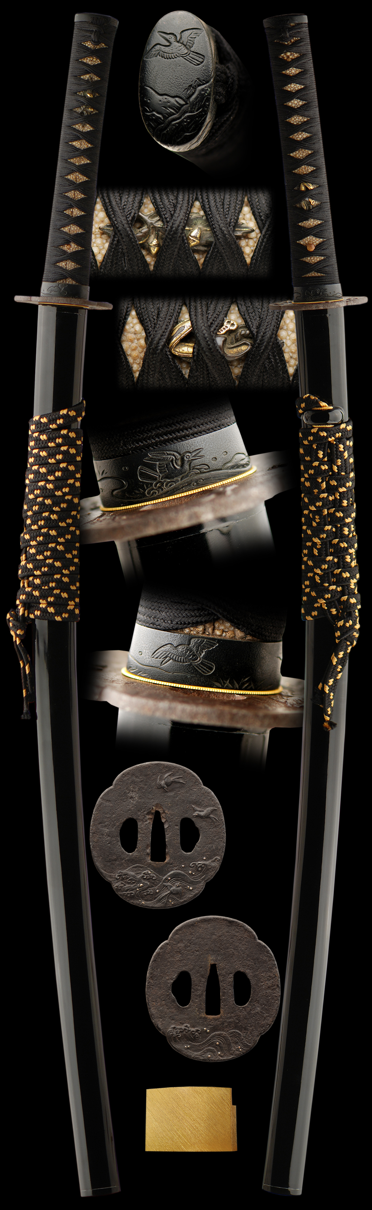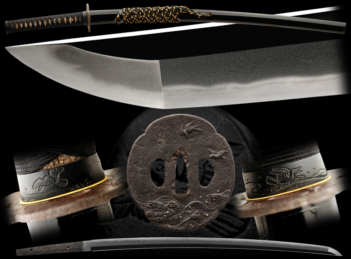 To begin with, the sword is light and elegant and is mounted with a beautiful Motif of Birds and the Sea. the Fuchi / Kashira are a delicately carved Shakudo of Sea birds frolicking in and above the ocean waves. The Tsuba is iron and most likely from the momoyama period. It is of the same Motif of Birds flying and frolicking in the Ocean. The Tsuka and Saya are finished in a matching black lacquer and ito. The braided black and cream sageo is of a high quality braiding.
