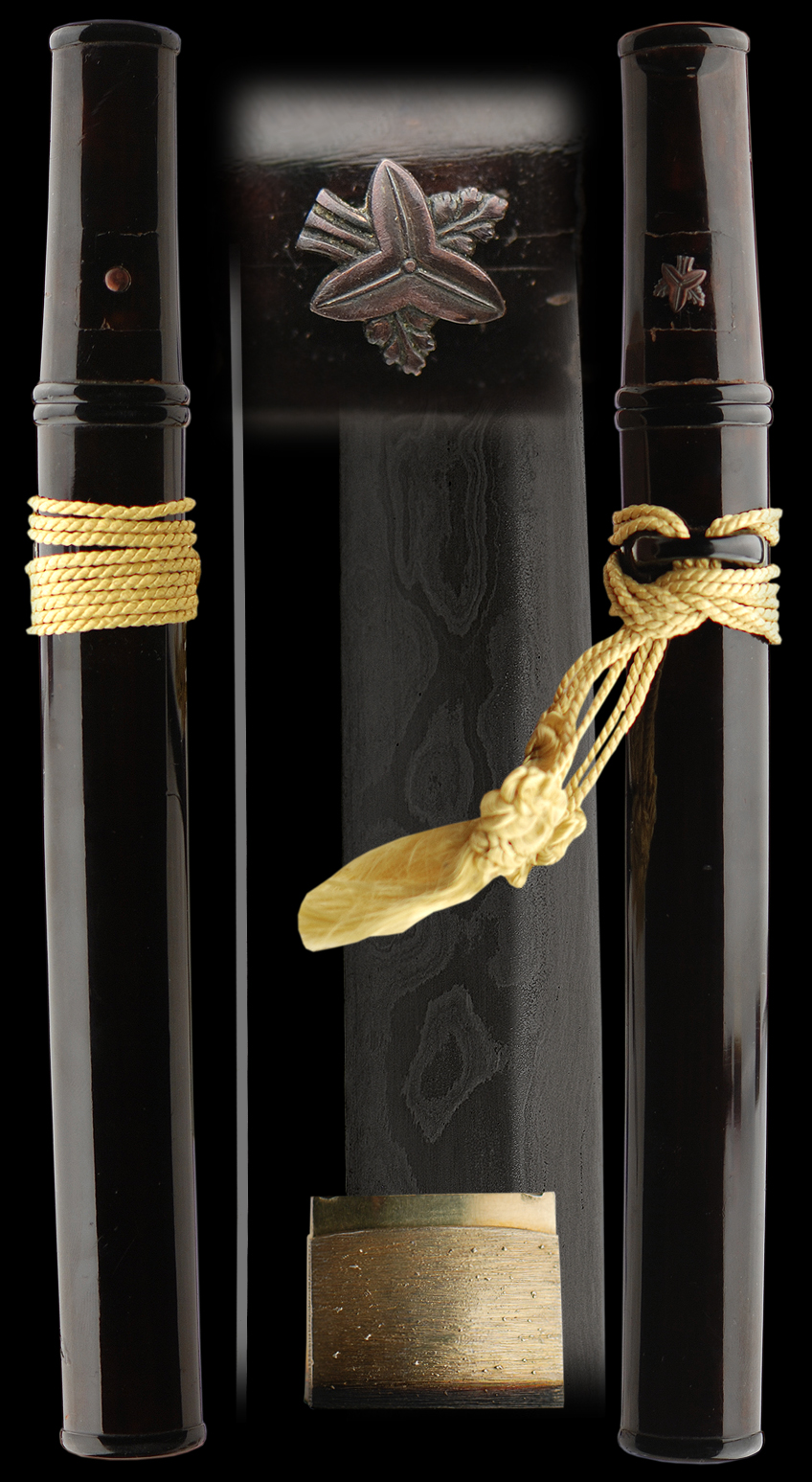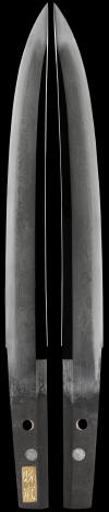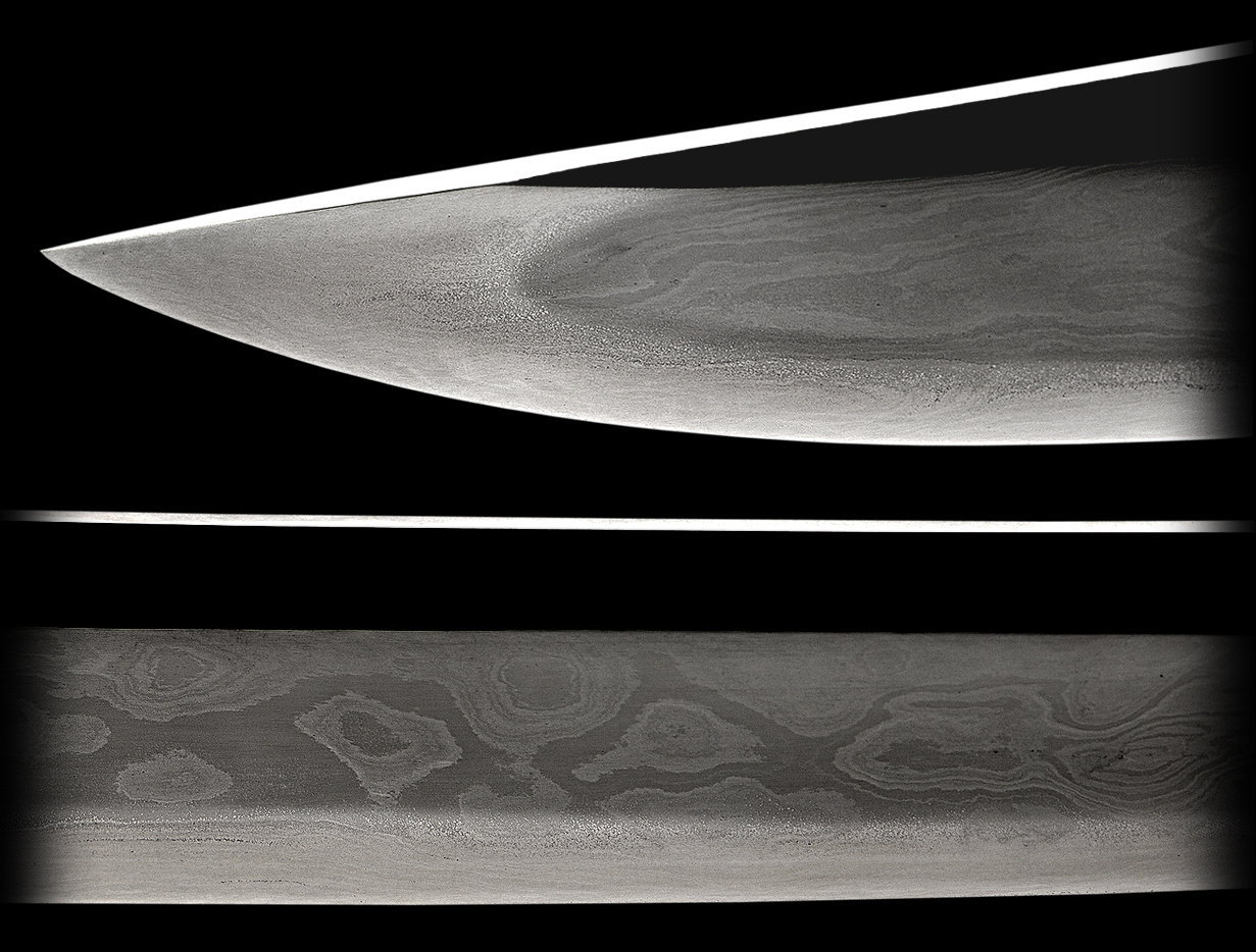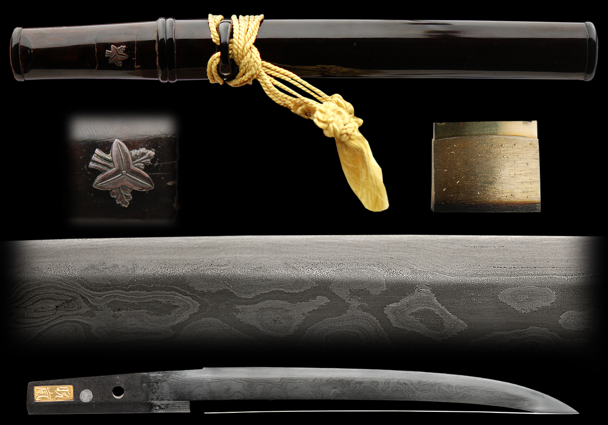 This rare and exquisitely made Tanto comes in a decent older polish. The hamon is extremely subtle with a chu-suguha temper with much ko-nie. The blade was made in a very interesting style, probably from the shin-shinto era. The hada is a exuberant mix of large mokume burls and very finely done. The sword still shows off the blades fine qualities and reminds one of a possible link to the Gassan tradition. The tang in inlayed with a gold signature of Kanearashi. More than likely it is the name of the owner of this tanto and not of a smith. It has been inlayed in a very unique way and it is certainly not common to fine this type of inlay. The blade has the SHOBU-ZUKURI shape and is very interesting..The koshirae are a mix of beautiful black lacquer work and appears to be from the Shinshinto era. This package is complete and well made finished with a beautiful gold/whitish tassel. There is a small menuki depicting a mon (family crest). A gold washed 2-piece habaki also finishes this blade.Place special attention to the details to see the fine activity that this blade exhibits.