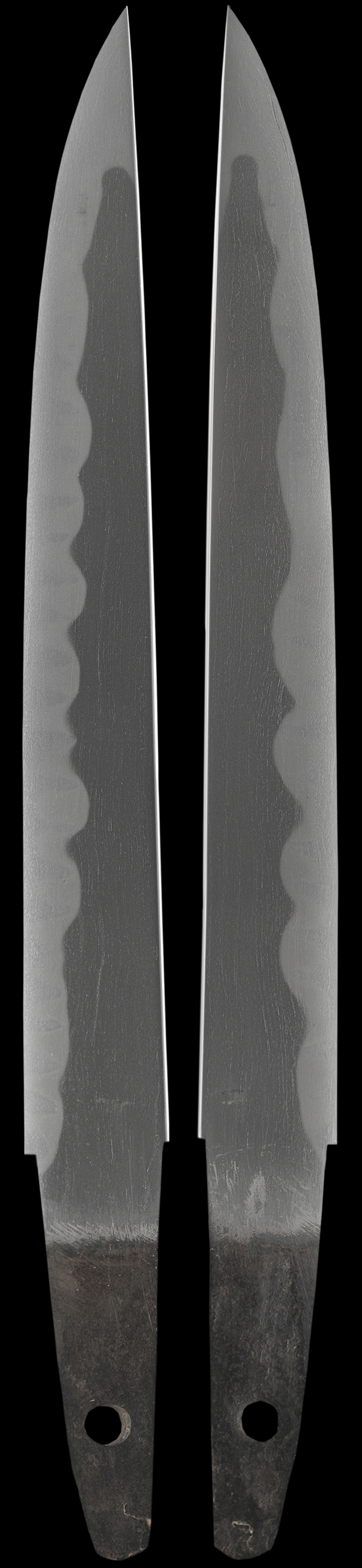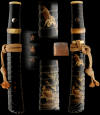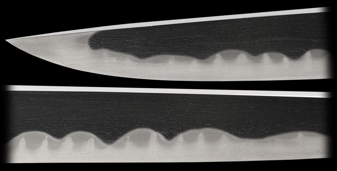This beautifully lacquered exquisitely made Tanto comes in a very nice older polish. The hamon is extremely subtle with a togare-ba temper. This blade was made in the mino style probably from the Shinshinto era prior to this century. The hada is a masame and very finely done. The sword still shows off the blades fine qualities even in an older polish such as this. The blade has the HIRA-ZUKURI shape.