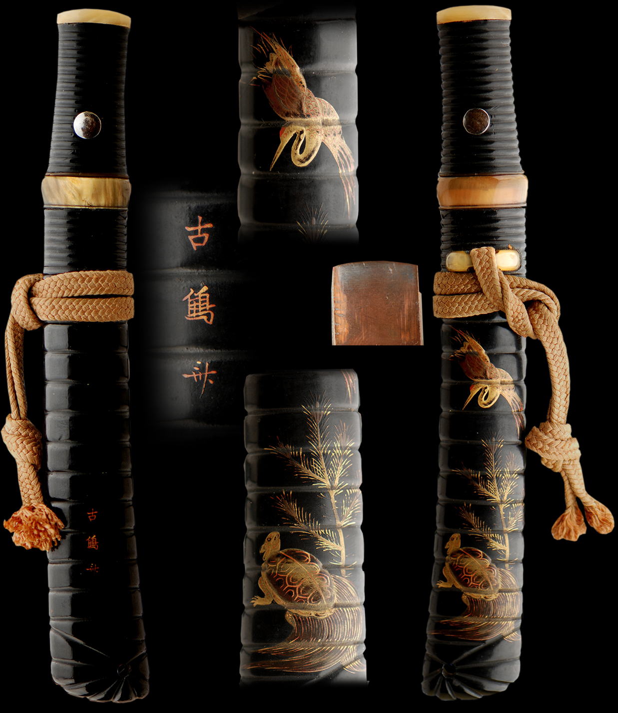 The koshirae is a mix of beautiful lacquer work with a turtle and crane motif and appears to be from the Shinshinto era. A beautiful ribbed saya with exquisite lacquering that is signed, this package is complete and well made finished with a beautiful gold sageo.