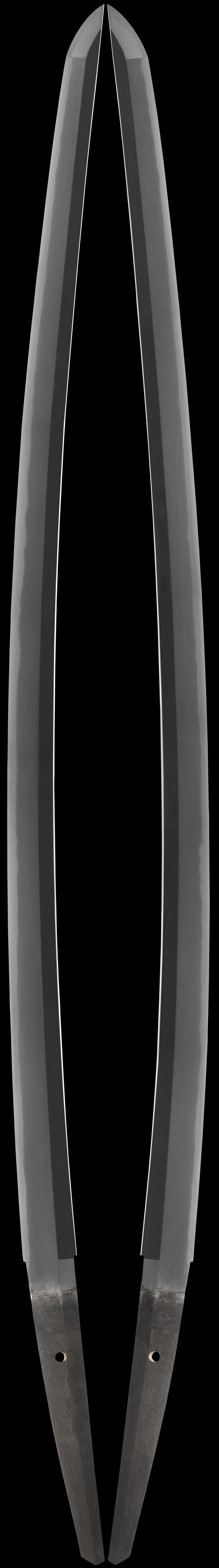 A beautiful Shinto possibly Shin-shinto Katana this sword is reminiscent of Gassan work. The blade is a longish mumei piece with spectacular hada and vibrant hamon. At 27 ¼” this blade is a true Samurai sword. The hada is a spectacular o-Mokume with large burls covered in ji-nie . There is longish wavy Masame throughout. There is chikei and much nie all over. The hamon is made up of ko-gunome based in sugu-ha with small puffs and clusters of nie the length of the blade. This is a fantastic sword with much to enjoy and appreciate.