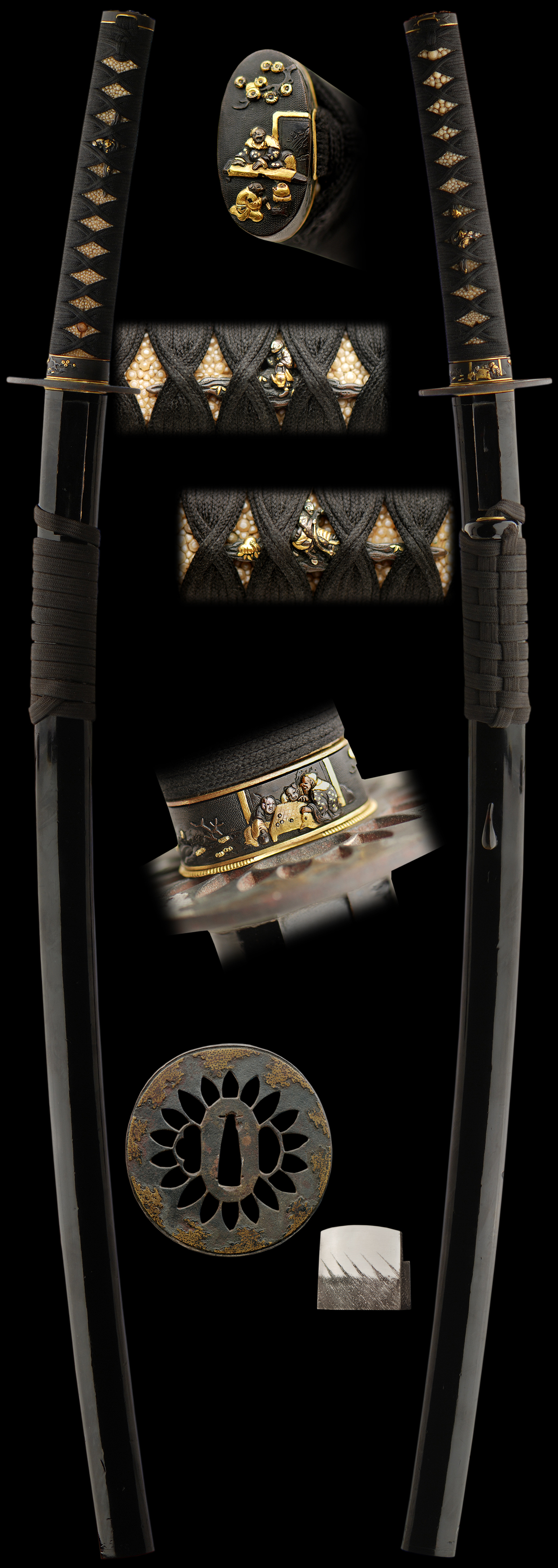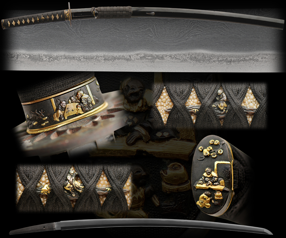 The koshirae is just as wonderful. There is a scholarly theme with a scene of men playing GO and enjoying the Tea ceremony. The menuki show the bringing of tea to the ceremony all in shakudo and gold. There is a pierced tsuba crowned in gold with black lacquered saya and matching ito and sageo of black. It is finished with a rain pattern silver foil habaki.