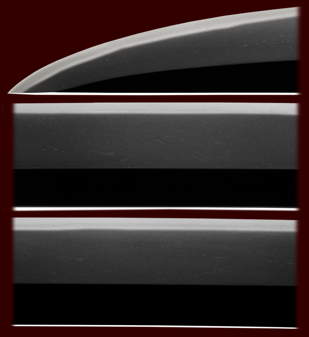 and Bungo jigane which was hadatachi jigane (visible to see the texture).This blade has a beautiful Shobu Zukiri shape with attractive Sori.