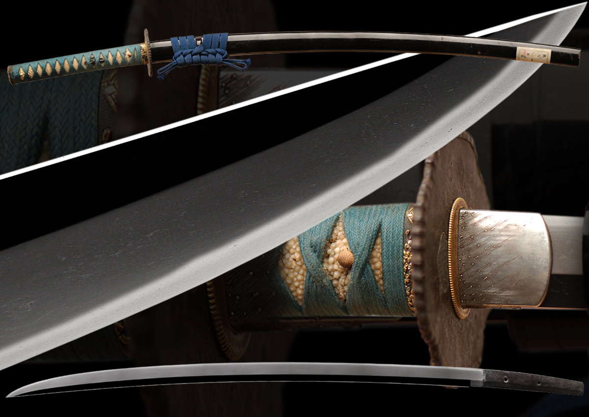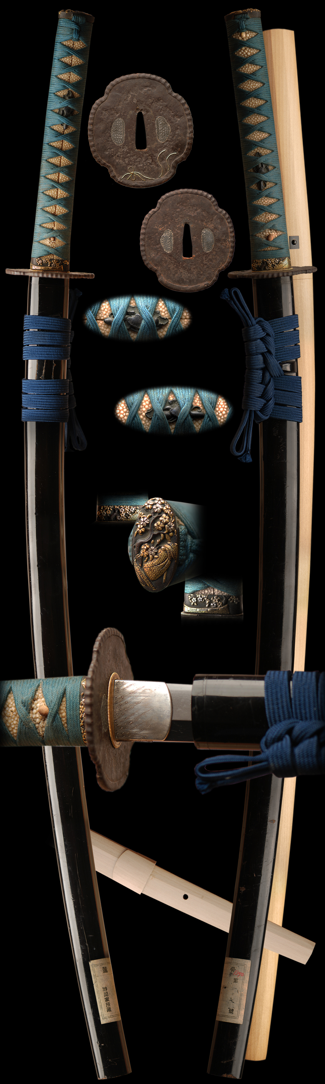 The blade comes mounted in an older mounting with floral motif that is of very good quality. The old lacquer though a bit scuffed still retains the older patina. The aquamarine ito is older and a popular color for Samurai. These are very fine original mounts that compliment this early blade.