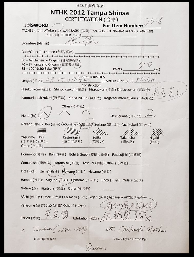 These are the NTHK work sheets from the last shinsa. The final papers are due to arrive in July. The final NTHK documents/papers will be forwarder to the new owners the moment we receive them.