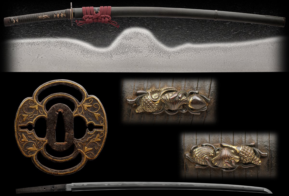 The Quintessential Shinto era Japanese Samurai sword, this blade though slightly suriage still maintains the original signature and attributes. The blade comes mounts with original mounts from when it was shortened. The blade itself is an exciting blend of Notare and Gunome with a beautiful thick frosting nie and nioi. The itame hada is tightly forged and very well made. This blade is a beauty to behold. It is documented as Nambamtetsu or foreign steel making this sword even more interesting.