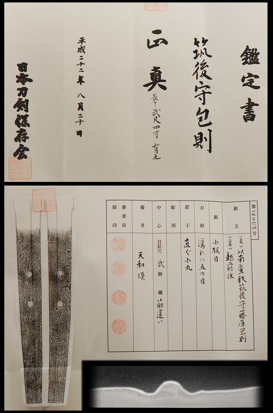 He is of the Shimosaka Ha, and sometimes a work of his is seen with a botan inscribed above his signature. (Wazamono) [TN: Echizen is almost at the opposite end of Japan from Chikugo.]