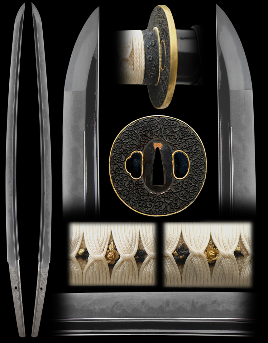 This Koshirai is very high quality and is in excellent condition. The color of the Shakudo is rich and very dark. The motif has very finely carved details. The saya is new and was custom made for the sword. The handle is wrapped in a very expensive string style wrap. Overall these are exquisite mounts for this fine sword.KANTEISHO