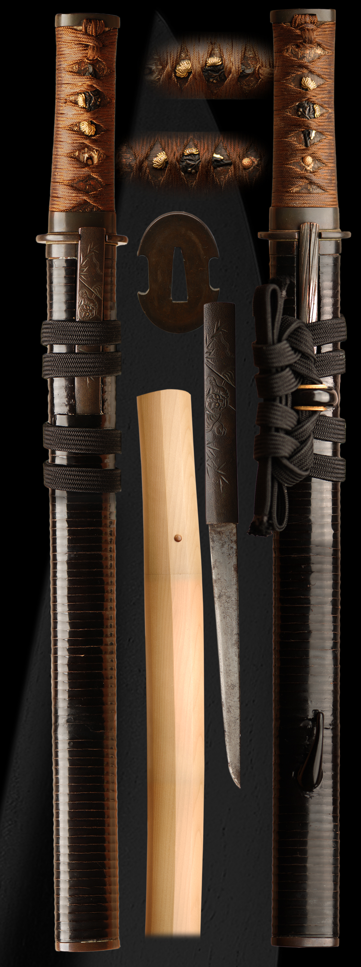 The koshirai is very beautiful and aged also. The saya is a ribbed type lacquered with gomabashi and kodzuka with tiger motif. The tsuka still retains the original brown ito with Peony menuki. A classic mounting that adds to this great sword.