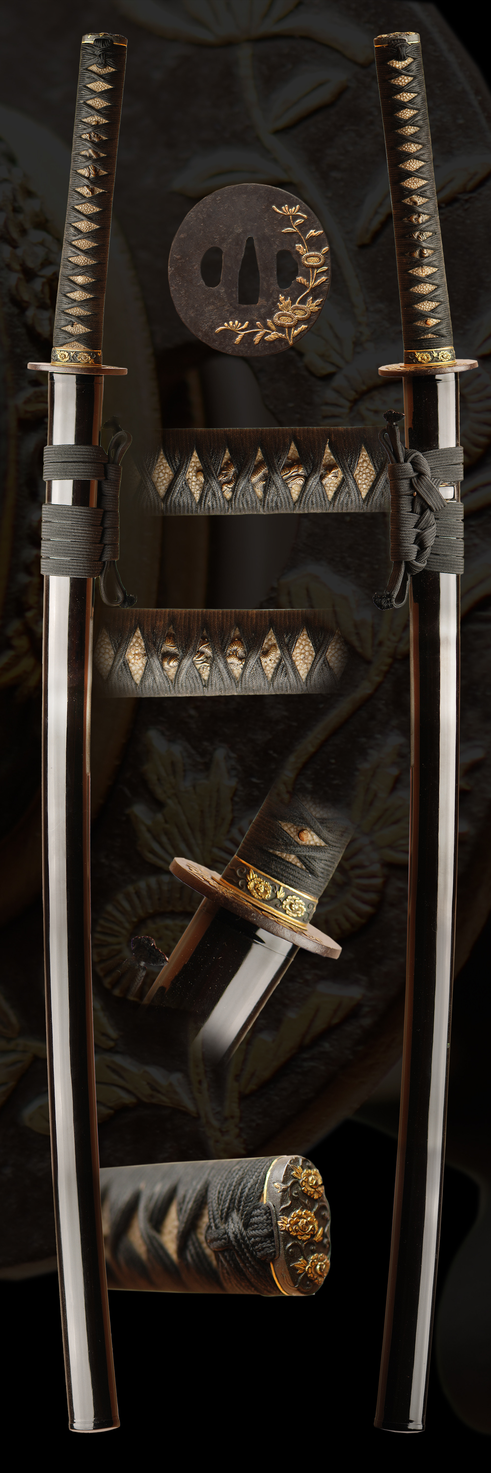 The Koshirae is stunning with Peony motif finished in shakudo and gold. The saya is a black lacquer with a purplish hue from speckles formed in suspension and black ito and black sageo to finish.