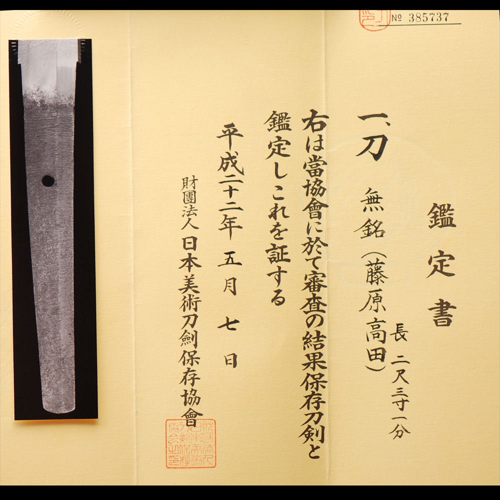 The above item, as a result of a shinsa at this organization, has been designated a HOZON T�KEN, and is confirmed as being authentic.