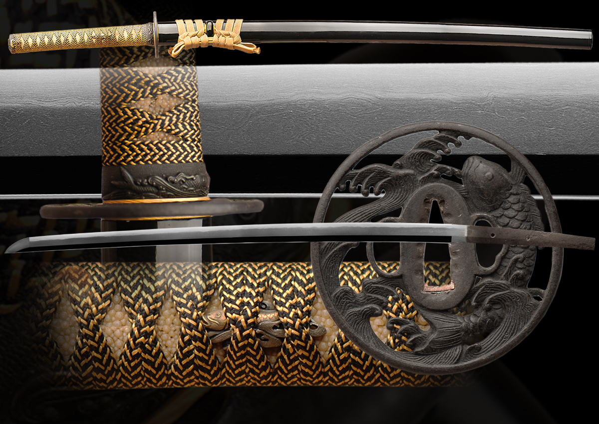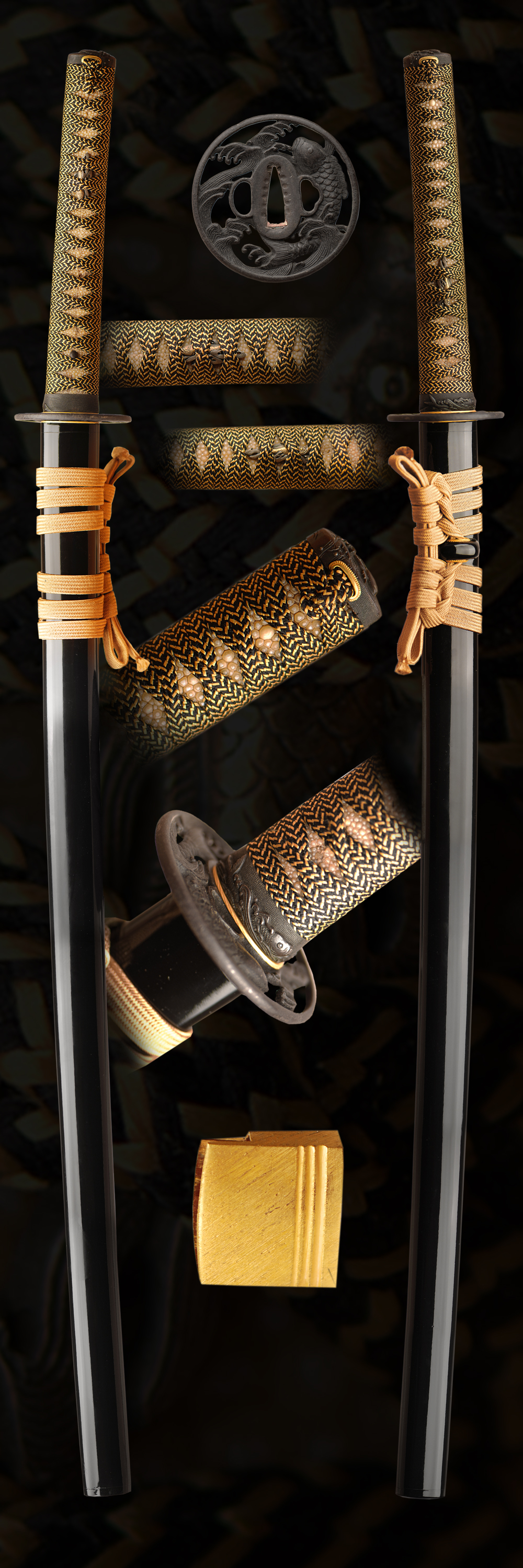 The Koshirae is stunning with a scholar motif finished in shakudo and gold. The saya is a black lacquer and black ito and black sageo to finish.