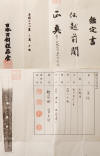 This is a very beautiful katana in original old polish. It has an abundance of activity within the temper line (hamon) that gives this sword a very well balance look. The forged steel (hada) is also very well made and is in the itame style. The quality of this sword is high and it comes with original mounts that are also very elegant. The lacquer color is in the satsuma style and the handle has a unique style of silk wrapping not commonly found. The papers are attributing this blade to the echizen seki school of swordsmiths. Echizen blades were well know for their cutting abilities. Many samurai took pride in carrying a reliable sword like this one.