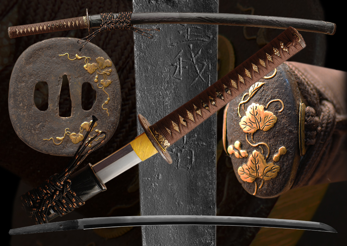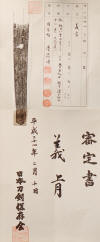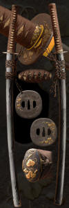 This katana has a good signature and is not cut down. It is over 28" long and has a very active gunome hamon. The blade is forged well and has some O-hada in many places. The sword is stout and healthy and comes with a restored saya/scabbard. The fitting are very interesting in that they are all matching and made by the same person. This was a true swordsman's blade and it is mounted in a strong subtle but yet elegant set of mounts. This sword comes with papers and its original mounts.