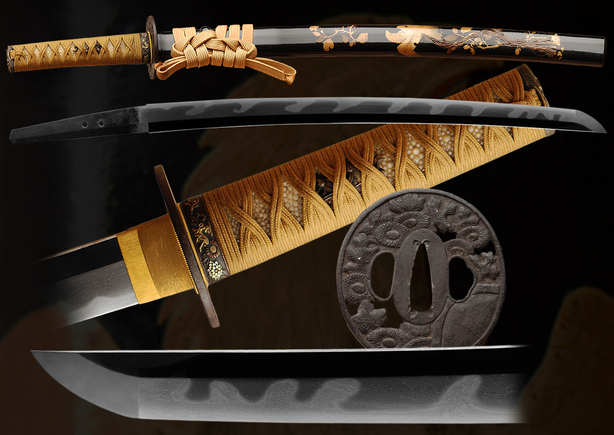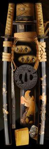 This is an extremely attractive sword because of the mounts and of the exceptional blade. To start with the blade has no flaws and is well balanced. The hada/steel is forged very tightly and has a milky look to it. The hamon/temper is very active and is loaded with nie and nio mixed. Making this style of hamon is very difficult, but the Owari smiths were known for this type of unique workmanship. The point is full tempered. Please look at the blade picture blown up to see how incredibly interesting this workmanship is. The mounts on this fine sword are also very interesting. The saya was slightly restored and is very unique. The fittings are of good quality and the handle has a string wrap in gold setting off the overall beauty of these mounts. It would be a good idea to make a shirasaya for this sword some day. This sword comes with papers and original mounts.