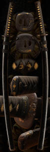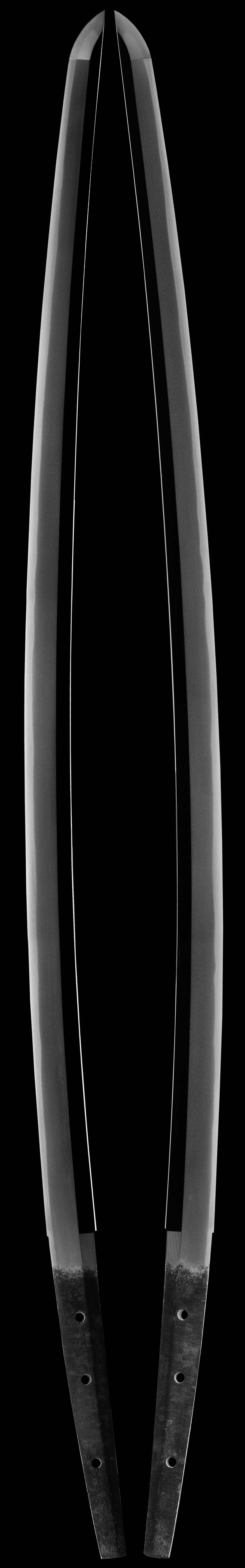 Shigekuni was originally called Kunisuke and later called Shrobei and is commonly known as Monju Shigekuni. He became a Kaji companion of Tokugawa Yorinobu. This smith is very highly rated at JO-SAKU Level and this is a flawless example of his work. The overall feel of this sword is very elegant and has a koto look to it even if it is early shinto. Its obvious looking at this blade why the smith is so highly rated. The hamon is not flashy but has a deep active appearance. In hand you will see many fine hataraki/activaty within the hamon and the hada has a smooth silky fine appearance expressing its quality. This is a very fine blade and it also comes with real original and un-restored mounts. The saya has leather covering it that has been lacquered and is in exceptional condition. The handle has its original wrap and the fittings are very fine and of high quality. The fuch/kashira are more than likely early edo and could receive good papers by themselves. This sword comes polished in shirasaya with a tsunagi to display the koshirai/mounts.