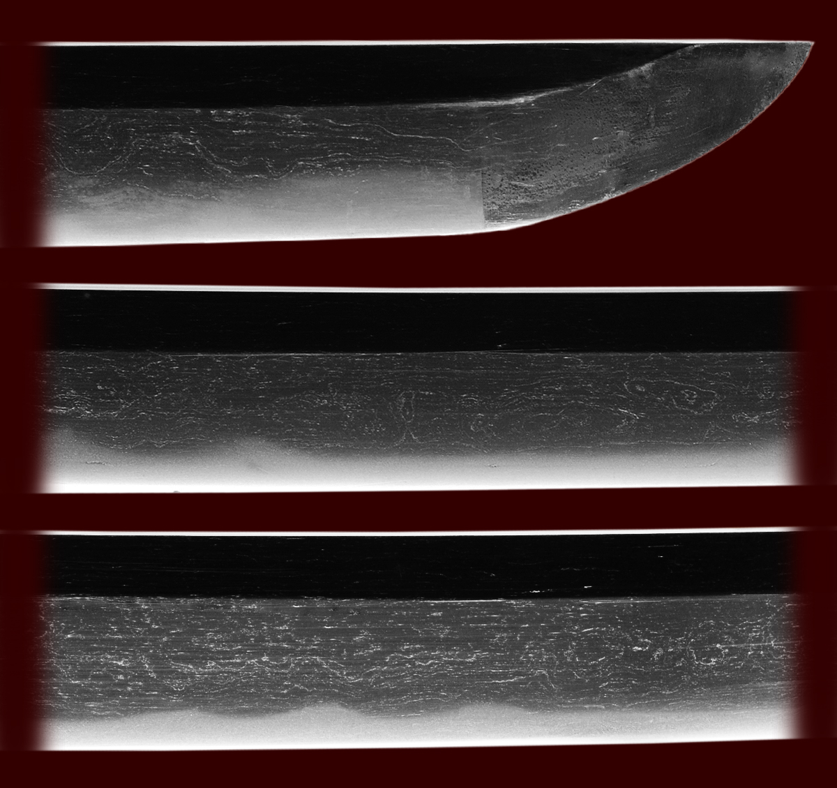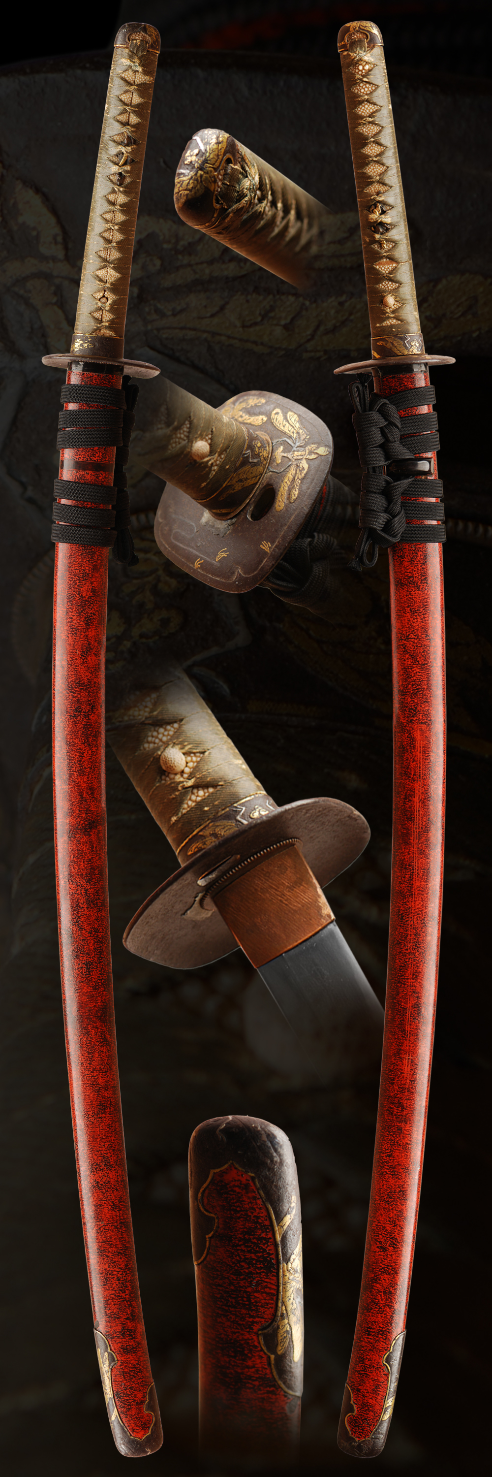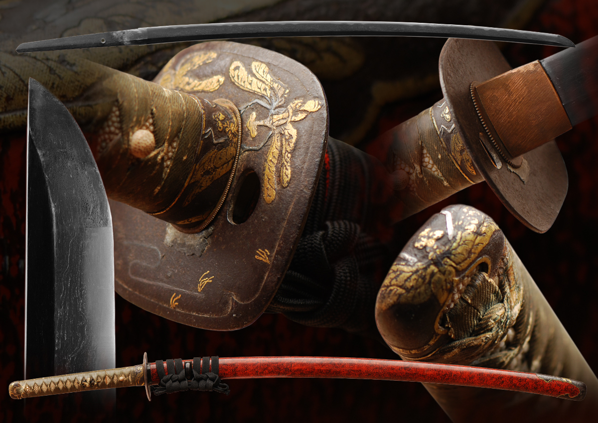 Kashu Ietada is a well known smith from the kaga province. This katana is almost 29" long and is a very healthy blade. These swords were famous for their cutting abilities. The hamon/temper on this blade is very active with many hataraki and is also healthy. The hada/steel is course and active and is very much forged in the kashu tradition. This sword in a fresh polish would be even more beautiful but the condition as is still shows well all the work within this fine sword. The mounts are all in a dragonfly motif and all made as a set. Mounts like this are not easily found so it adds greatly to this sword overall.