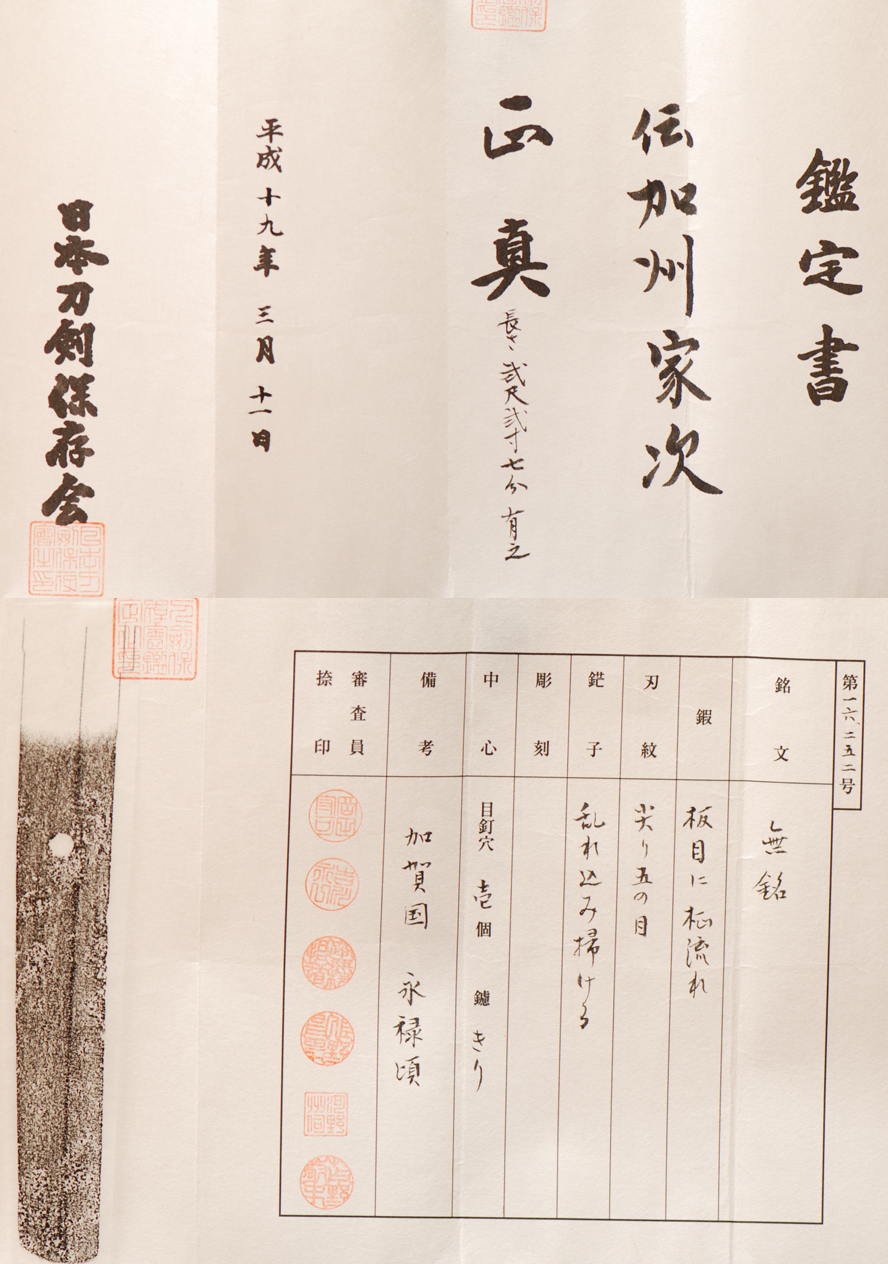 This long Koto era sword (1500's) has a very lovely sugata/shape and is very healthy for its age. The hada is course in in some areas as many koto kaga blades are. The hada is a mix of itame and nagare. the hamon is very active and looks even better in hand. The nakago is original and not cut down or altered. The overall shape and look of this early blade is very elegant and reminiscent of the fine older blades. It comes with a solid silver habaki and a shirasaya with sayagaki/writing and a inlay in ivory for the horn pin/mekugi. It comes with papers and is completely in restored condition adding to its collectable appeal.
