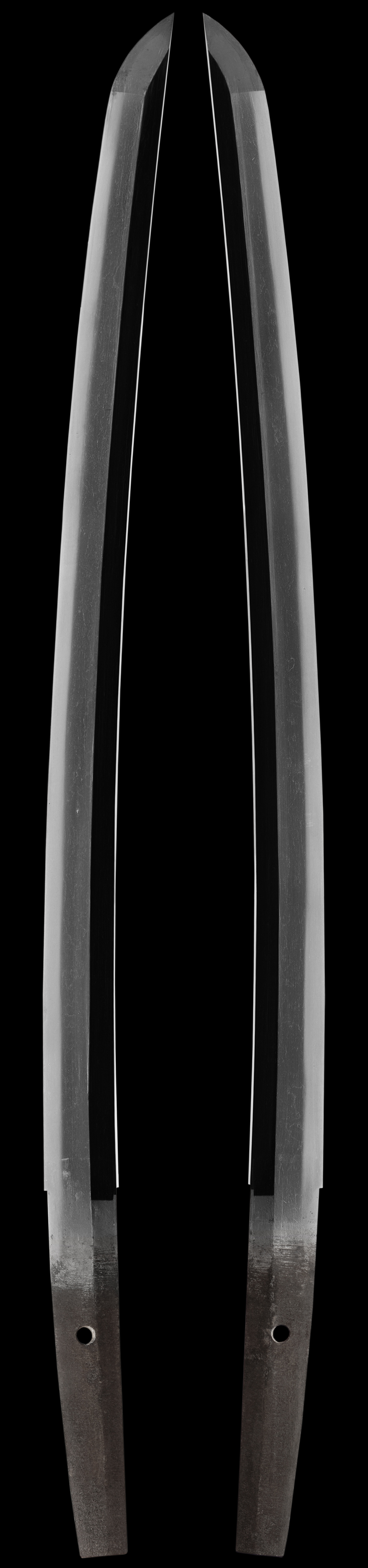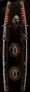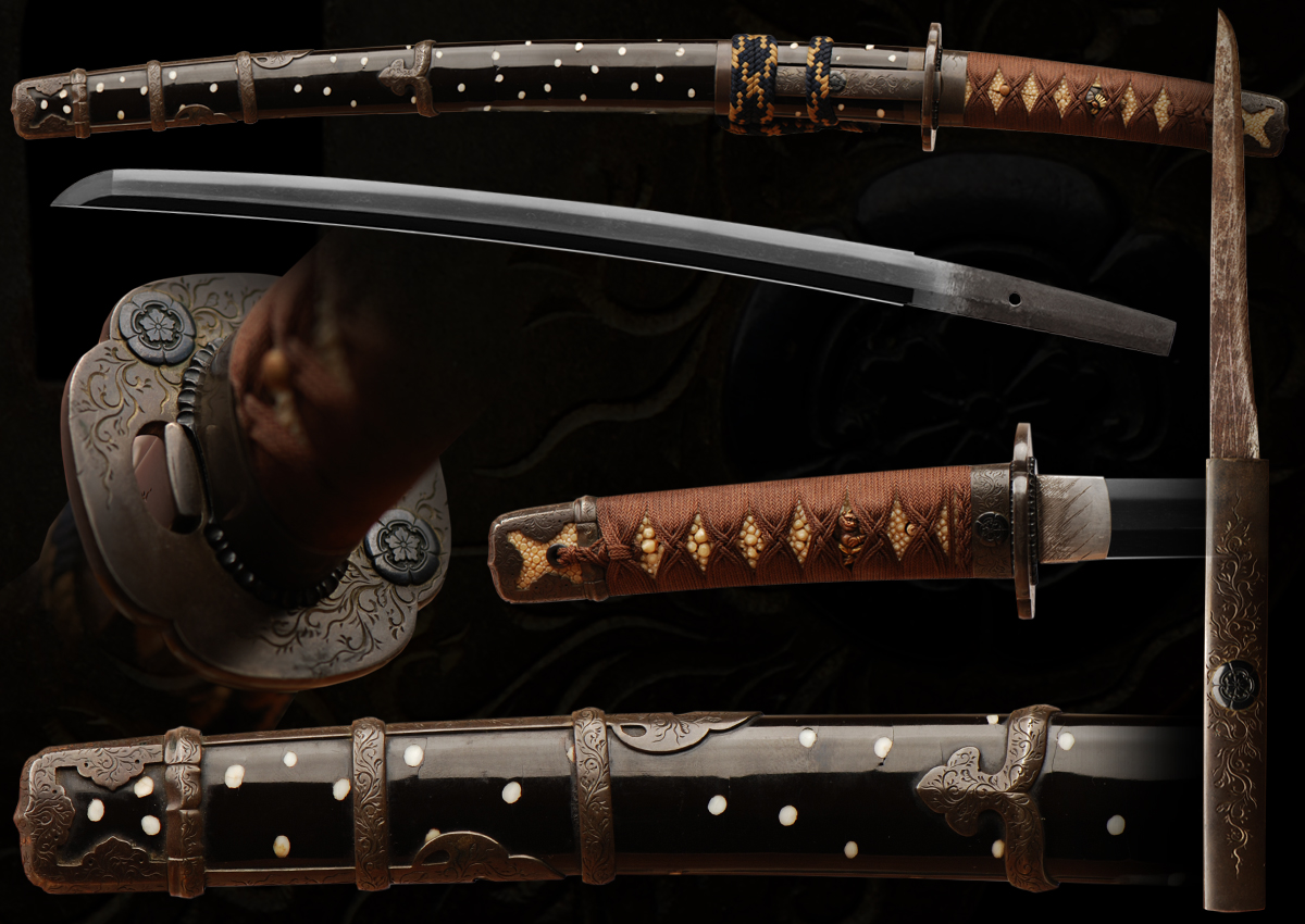 This is a very fine quality old koto sword. We feel that it will do very well at shinsa if submitted and has no flaws. The hamon is nie deki with thick nio also in places. The hada is forged well and the overall feel of this sword is of excellent quality. The mounts are also very fine quality and are completely matching with mon on the fittings. The fitting are all silver and have a beautiful patina to them also shakudo was used in the mon and it is important to note that the fittings are complete and nothing has been altered on these mounts. The handle is original and has an older string wrap making it look even more elegant. The scabbard/saya is very sound for its age and has shells inlayed in the lacquer . This is truly a beautiful sword.