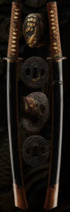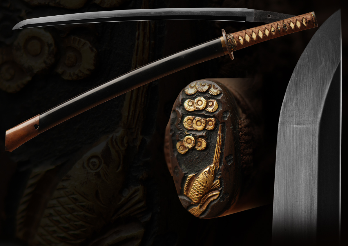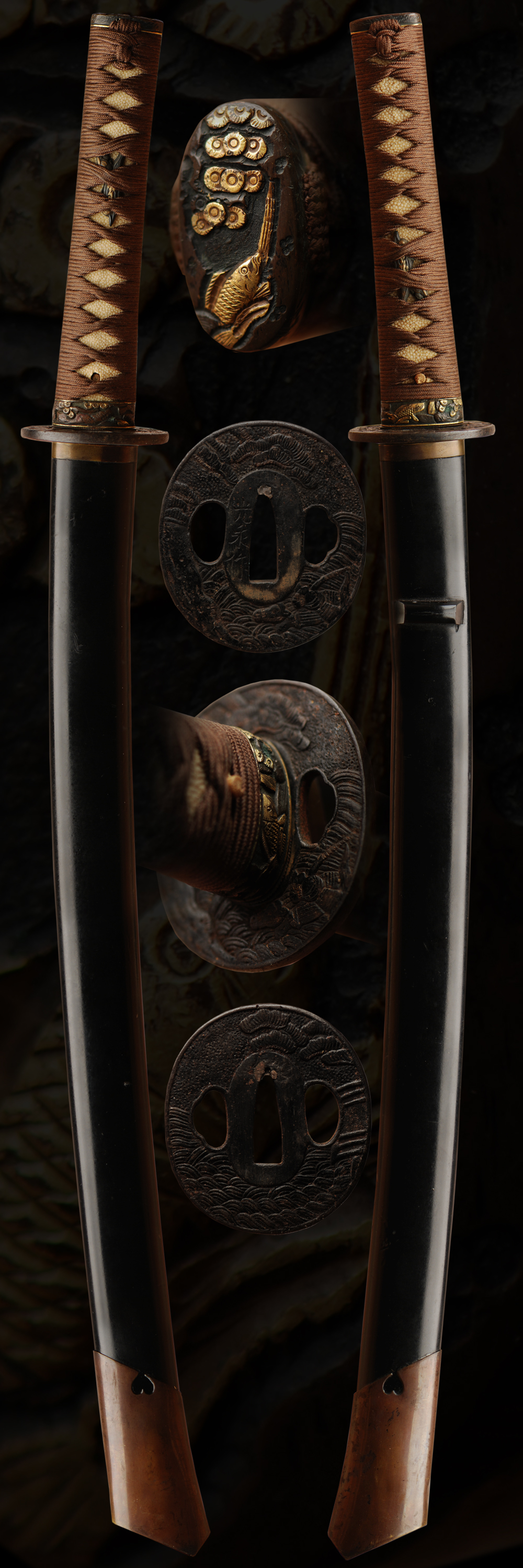This is a very nice samurai wakazashi in overall good condition. It is in the same condition from when it was brought back from Japan after WWII. If polished it will be even more beautiful. The hamon has a very good hataraki/activity that even in the older polish it can be appreciated. The hada is well forged and comes in mounts. These are original mounts and are in good condition. The handle is in an older wrap that is also in good shape and the saya/scabbard is sound and has a very attractive copper end cap. This blade should go to shinsa and will receive papers as it is from the 1700's.