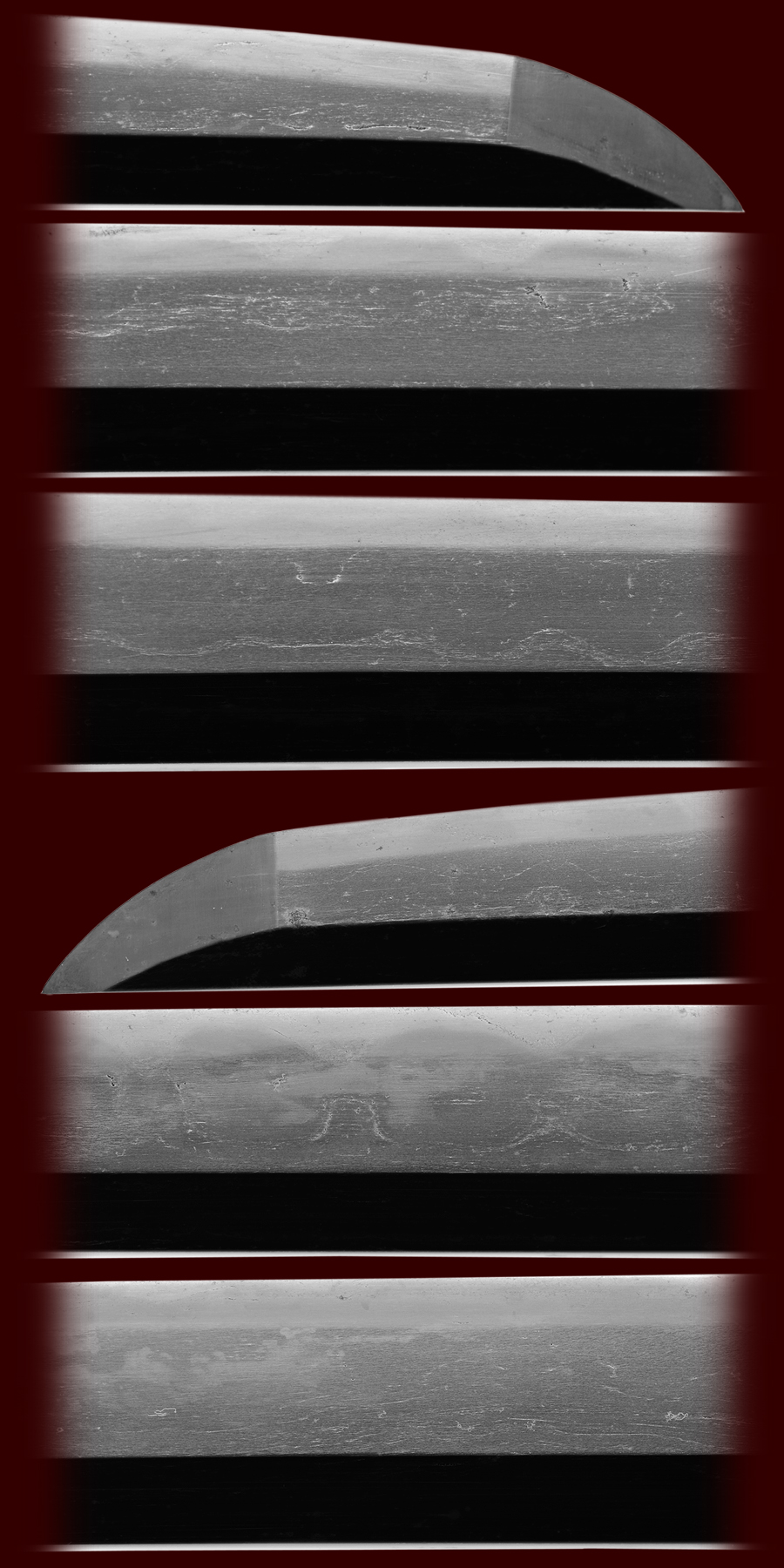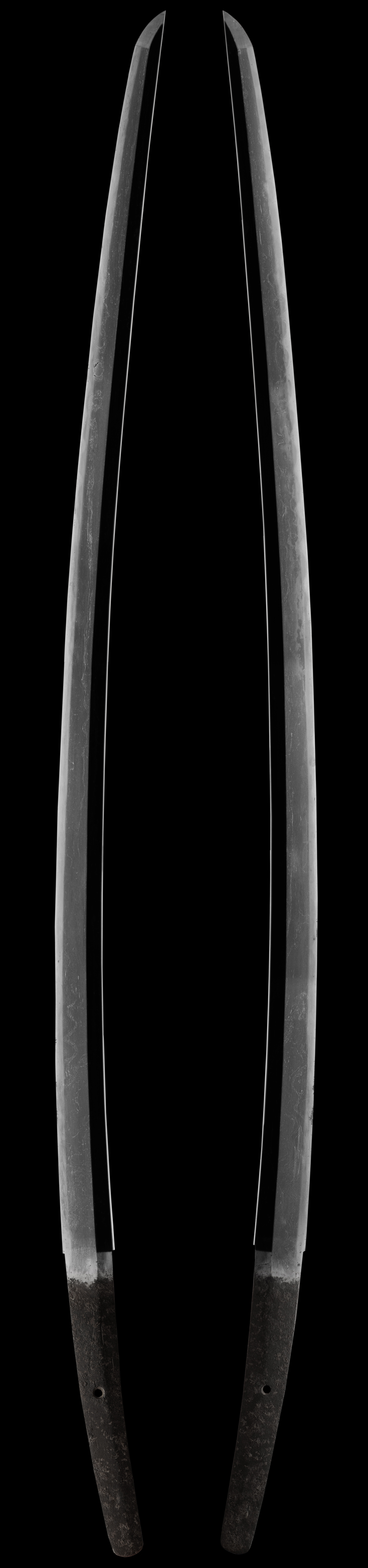 This is a very old katana from a very important line of smiths. The gassan school is very highly regarded and this is a very good example of the workmanship they produced. Many of these swords are unsigned but are very easy to pick out by the workmanship in the hada/grain pattern they were famous for. The ayasugi hada is very visible in this blade. This sword also is a signed blade making it even more desirable. The overall condition is poor at this time and is in desperate need of restoration. We feel that if restored properly it will come back and will be a sword that can then be submitted to shinsa but the restoration must be done by a professional. this very old sword can easily be destroyed if given to the wrong polisher. In any case this is a sword that someone will have to take a shot at to restore it. In the end it has the possibility of becoming a very important sword.