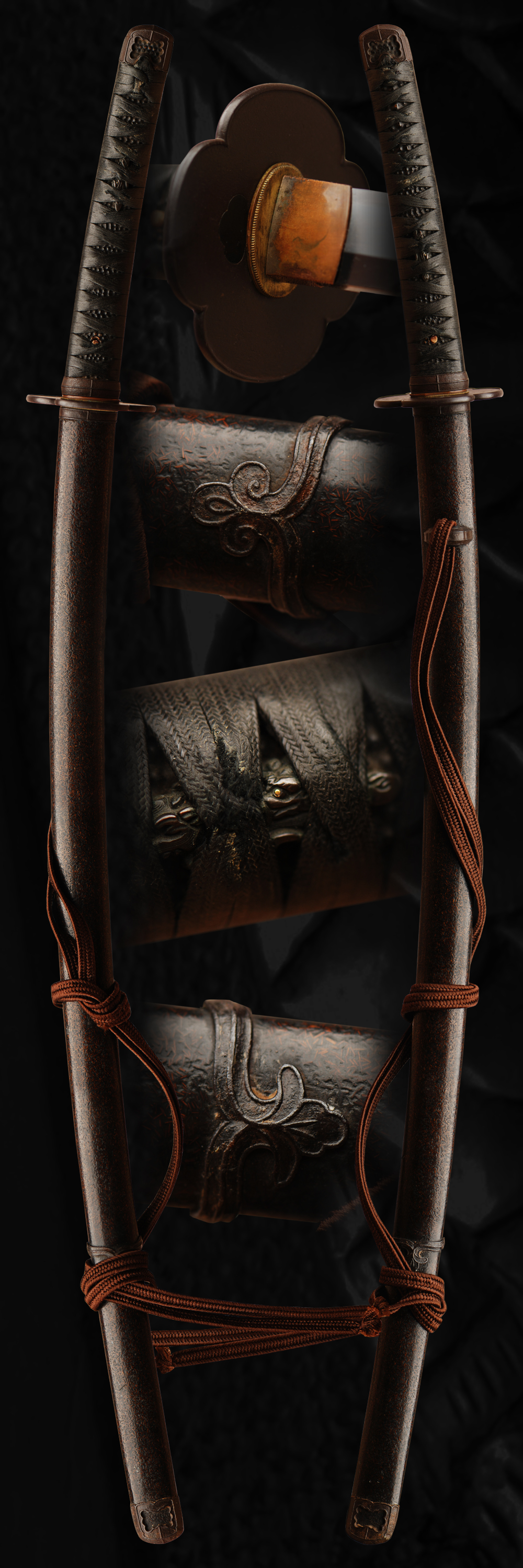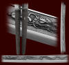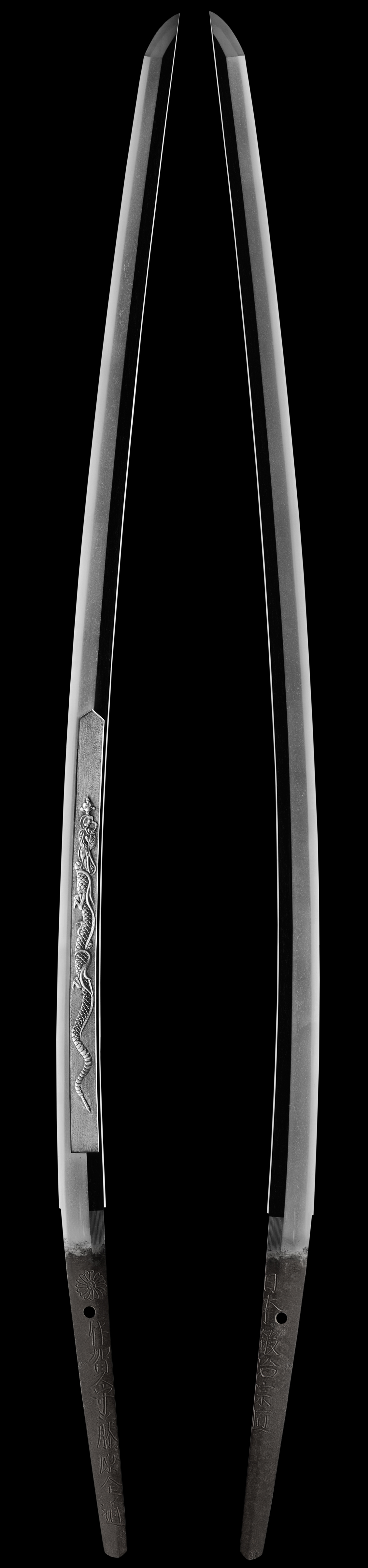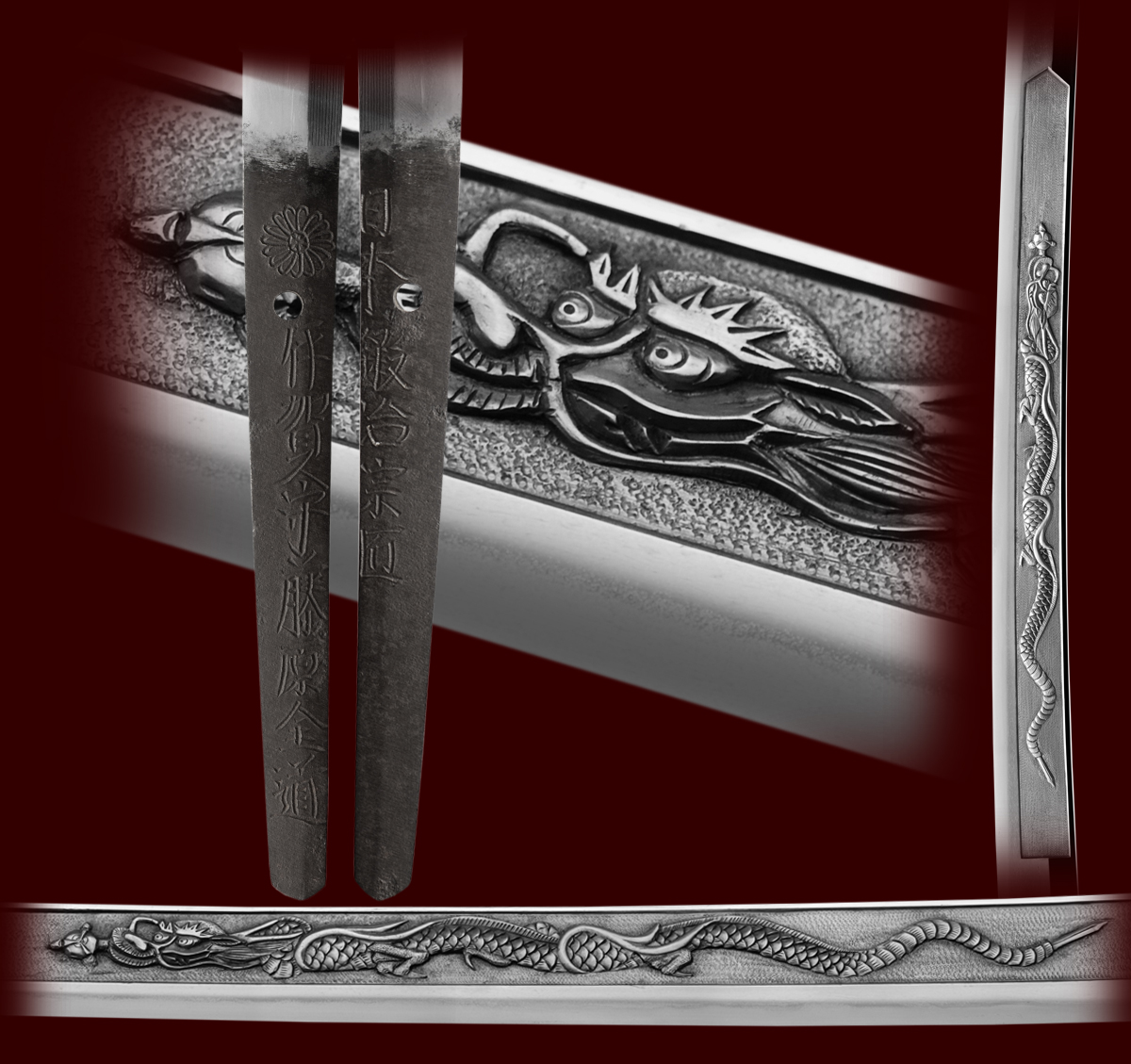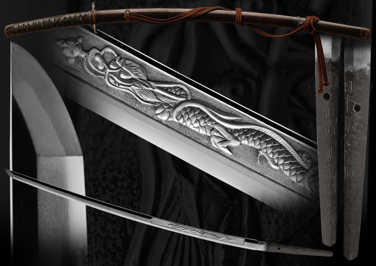 This is a very fine quality Iga No Kami Kinmich Katana. We guarantee the signature to be 100% correct and will buy it back if it does not pass NBTHK shinsa. This long blade was made in a koto style. It is very well balanced and the shape is elegant. The hamon is a mixture of nie and nioi. The nioi is thick and the hamon has many ashi, uchinoke and other hataraki. The hada it very silky and well forged. It is itame and also has a beautiful milky appearance. The sword also has a very interesting and well done horimono/carving of a dragon. This carving is very crisp and expertly done. It may have taken longer to carve this dragon than to make the sword itself. This blade has no flaws and comes in its original mounts. The mounts are in true samurai style. They are all solid iron and matching. The saya is made of pine needles in lacquer and the handle has its original old wrap. This is a very fine quality item that only need to go thru shinsa some day.
