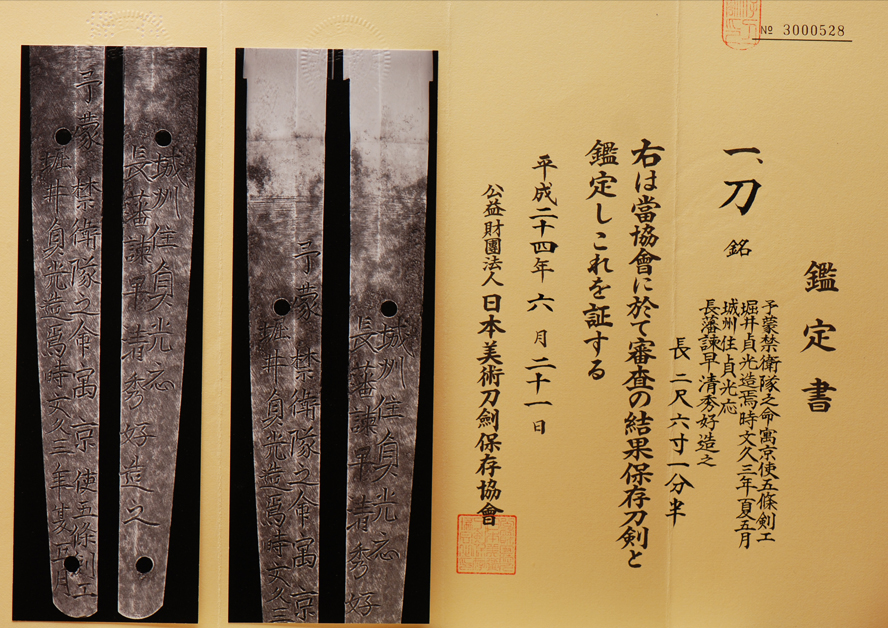 (Basic translation is that this sword was made for a choshu member as a special order by sadamitsu in 1863 on a summer day.)