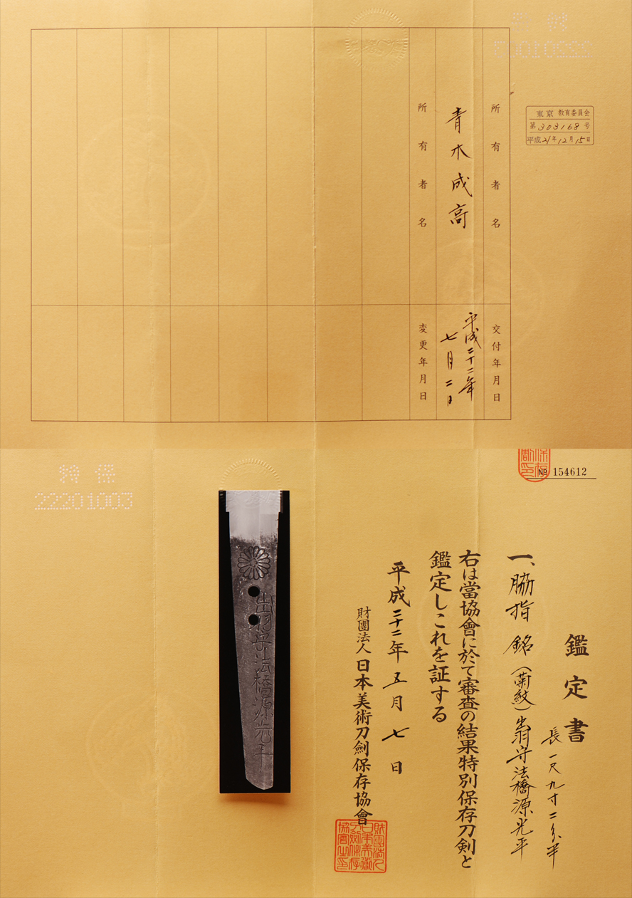 The Ishido school originated at the Sekido Temple in Omi Province around the Kanei period (1624). From there the smiths went to various sections of the country to found branch Ishido schools. Some went to Kii Province and came to be known as the Kishi Ishido. Later Tameyasu led this group to Osaka. Other smiths of this school went to Edo, the most famous of these being Ishido Korekazu. Mitsuhira was one of the students of Korekazu.