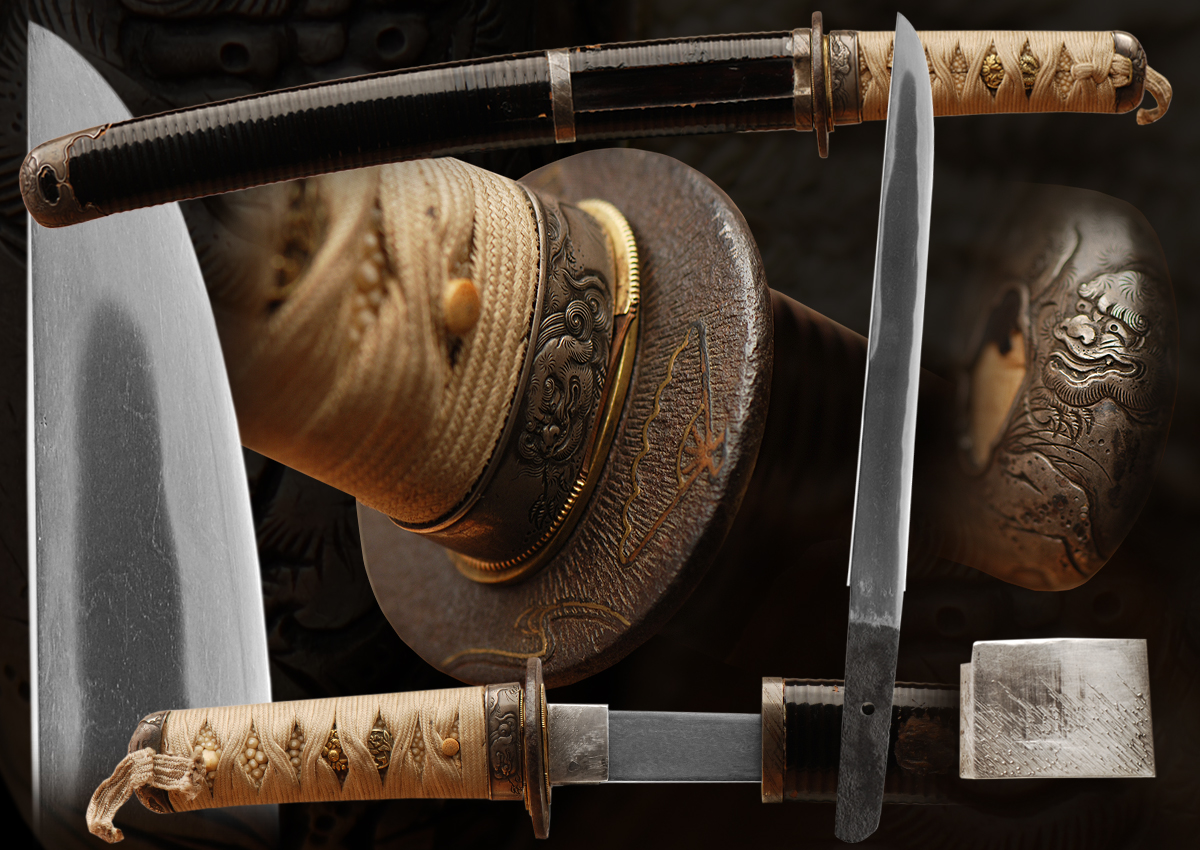 This tanto should be submitted for shinsa and is in a good old polish. The blade is well made and the hada is forged tightly. The hamon has good hataraki/activity. This fine blade comes in original mounts that are mostly silver. The fuchi and kashira are very well made. The only thing we would recommend is to have the handle re-wrapped in the future.