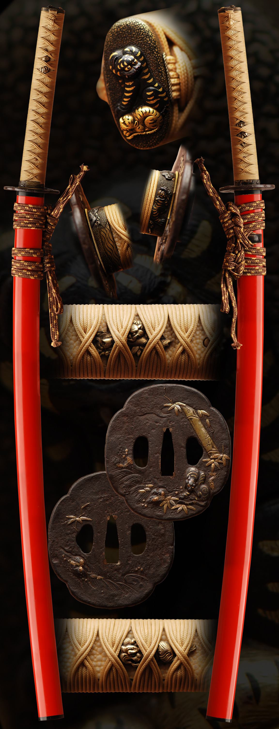 This is a long healthy katana in solid mounts. The blade is of good quality. The hamon has many hataraki/activity that is more easily viewed in hand than in the pictures. The hada is tightly forged and has a subdued appearance. This beautiful sword is in mounts and is from the shi-shinto era and comes with papers. The fittings are especially well made and of high quality. They are all in one matching theme of tigers. Overall this is an outstandingly mounted daito or katana.