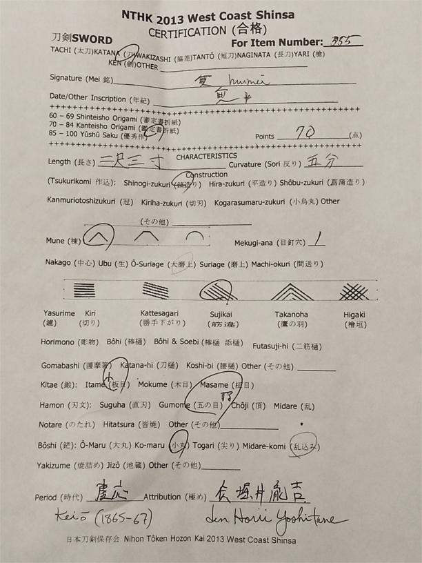 This evaluation sheet showing that this sword passed the recent shinsa held august 2013.