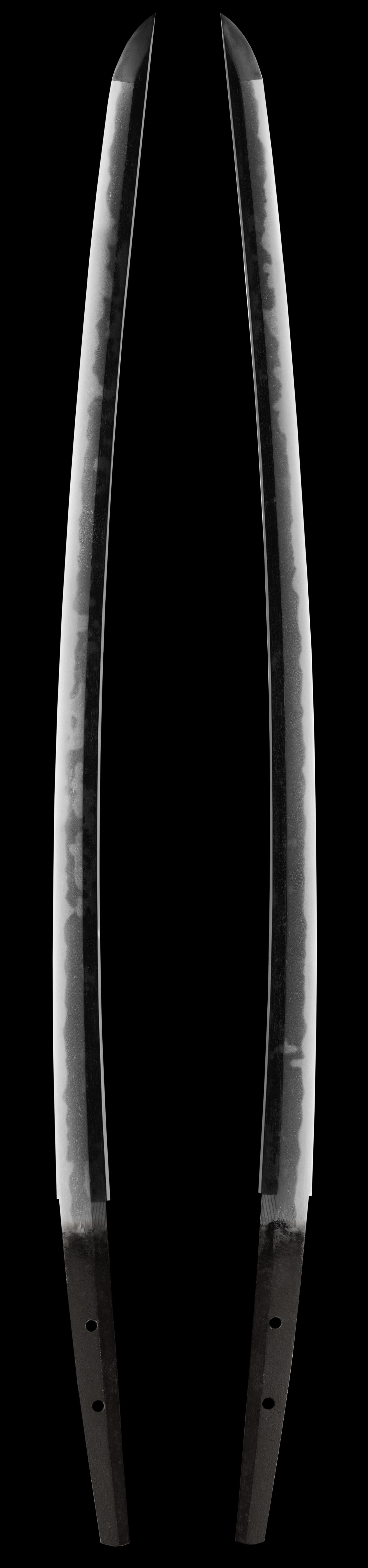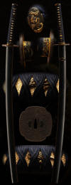 The shitahara school of swordsmiths was very famous and is desirable with collectors. This long katana is extremely impressive with its full temper that is loaded with activity. One side almost looks to be on fire with activity. The hada has some very interesting forging also and is well made. This stout blade is of fine quality and comes with fine fittings also. The saya has been restored to its original finish. The overall feel of this blade is that of power and strength. This katana comes mounted and has papers attesting to its quality.
