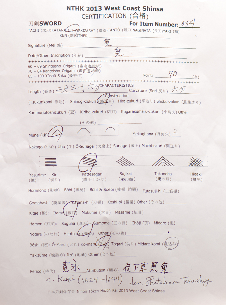 This evaluation sheet showing that this sword passed the recent shinsa held august 2013.