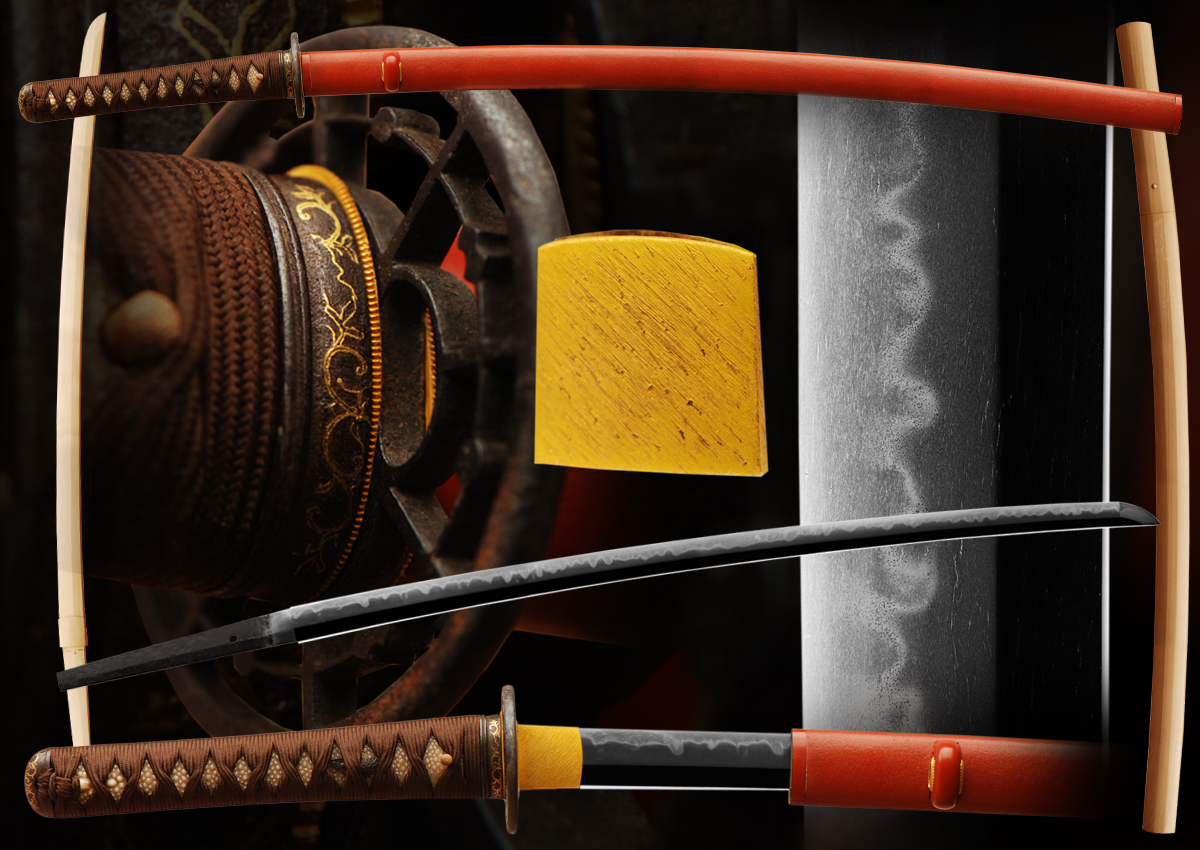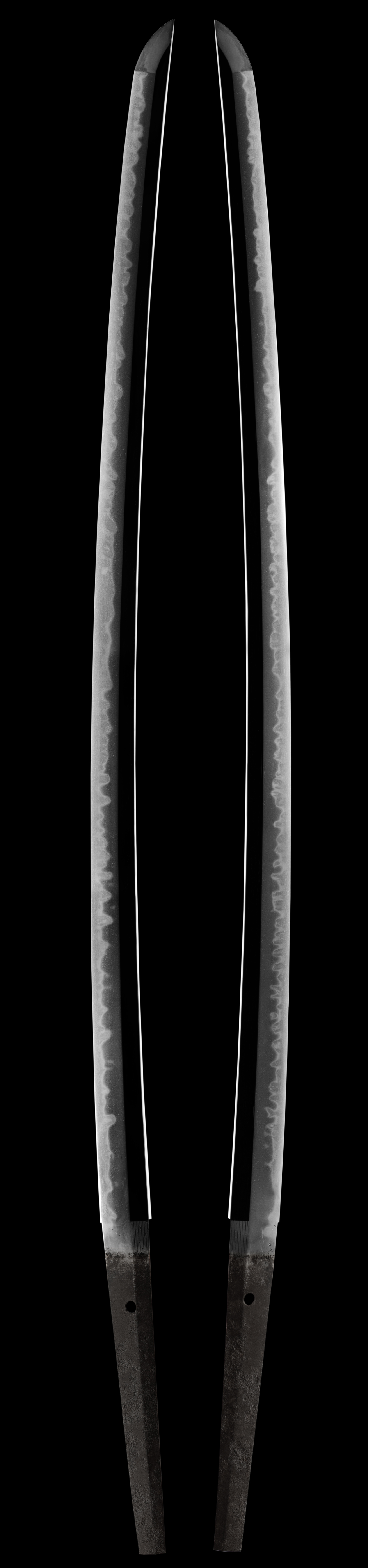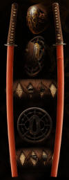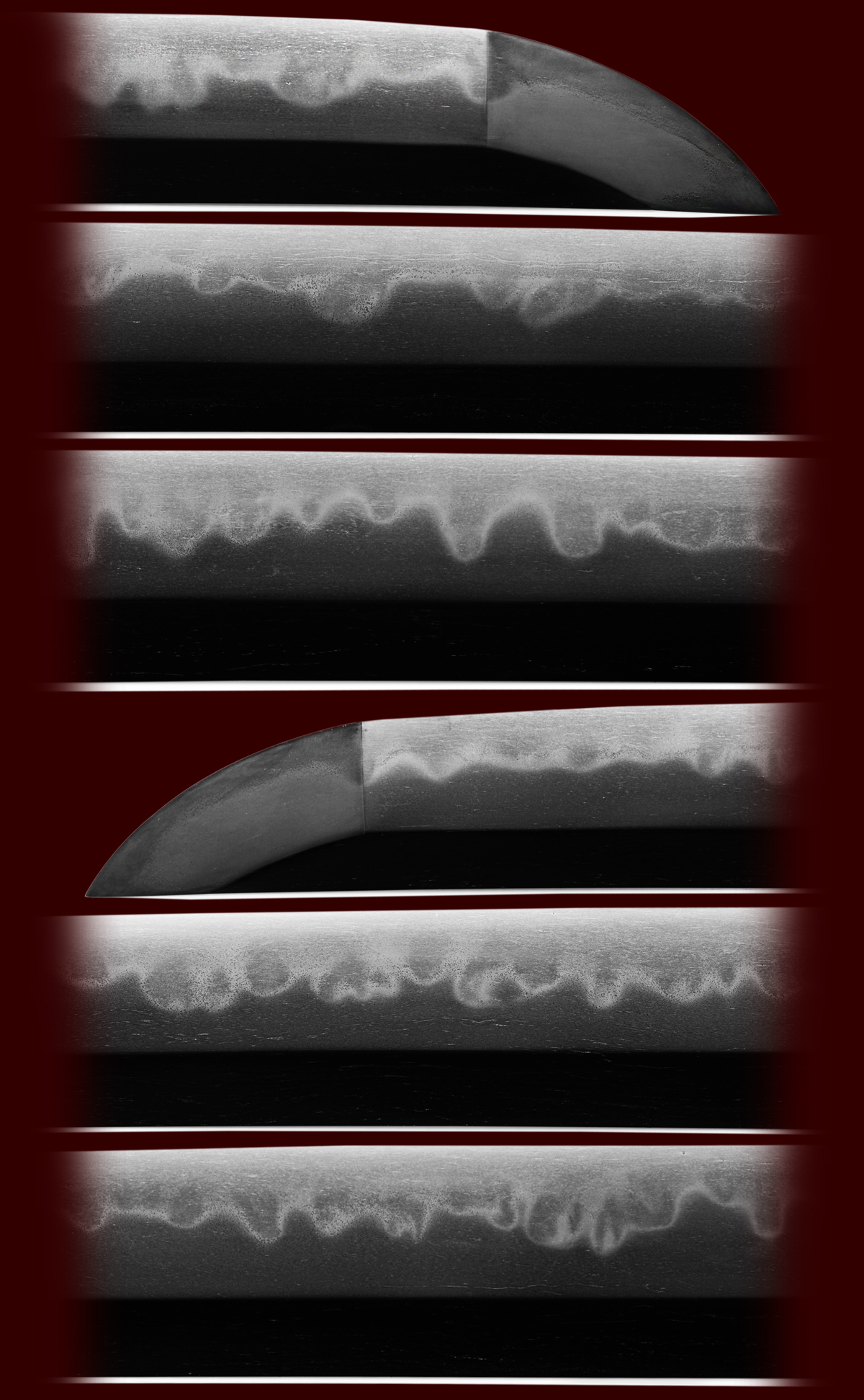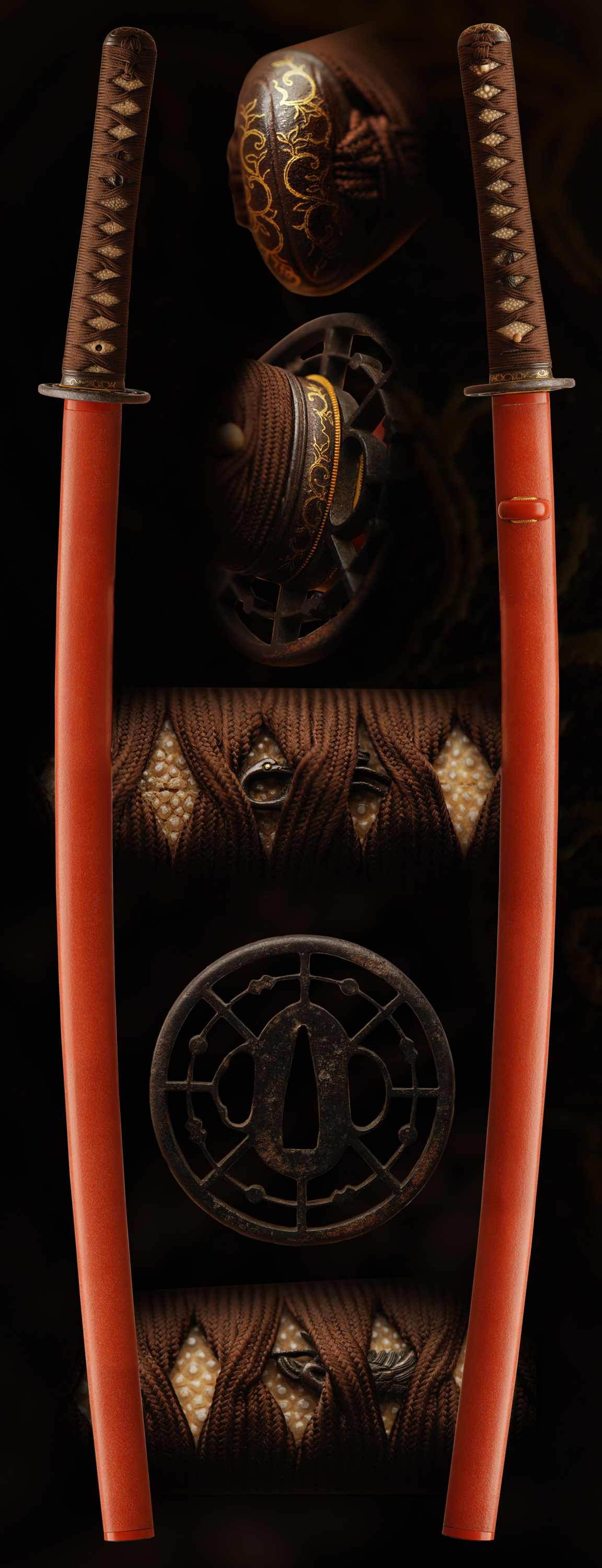 This is a unique yokoyama Sukemori den katana with fine restored koshirai. The hamon is active with many ashi and haraki mixed. The sword is on the longer side at 27" and has a very good balance. The hada is milky in color and is tightly forged in a itame pattern. The curvature is a very nice tori sori adding to the balance of this sword. The Yokoyama line of smiths were well regarded for their exuberant hamon styles. The fittings are also very nice with a satsuma style saya and higo koshirai. This sword is in fresh polish, comes with mounts and papers authentication the sword and quality.