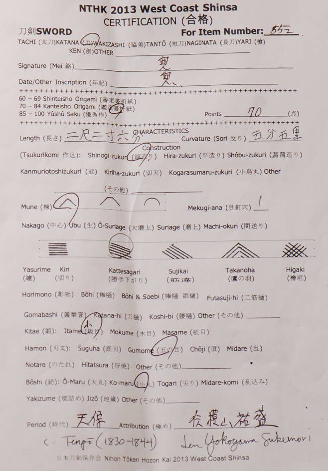 This evaluation sheet showing that this sword passed the recent shinsa held august 2013.