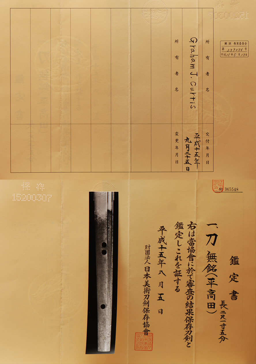 There is nothing in the Meikan in reference to TAIRA TAKADA. However, there is a write up in the English translation of the Nihon To Koza, Volume 3, on Page 359.This sword is on consignment.
