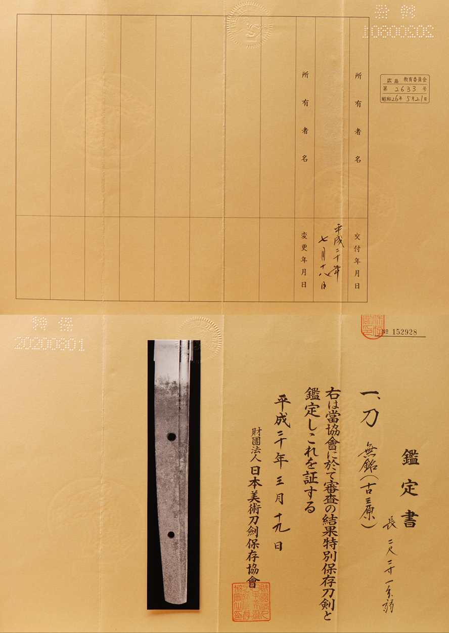 As a result of a shinsa at this organization, the above item has been designated a Tokubetsu Hozon Token, and is confirmed as authentic.