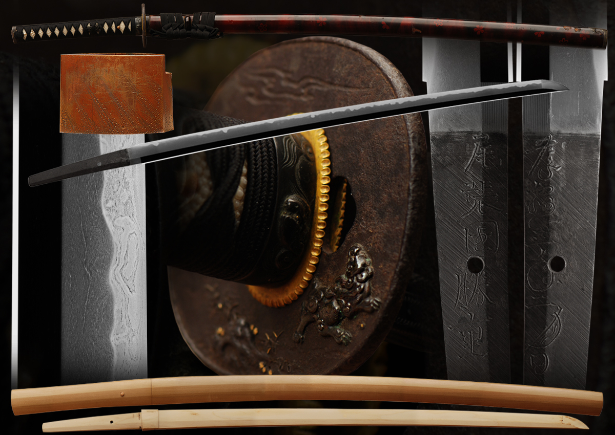 This is a signed and dated katana from the owari school smith Katsushige. This is a very long stout sword that is extremely well balanced for its size. The homon has very good hataraki/activity, please take a good look at the pictures. The hada is forged well and is very soft and milky looking. Katsushige is well regarded smith and a sword not only made by him but signed and dated also is a great collectable katana. This long katana comes with original mounts in shi shi motif that is all matching.