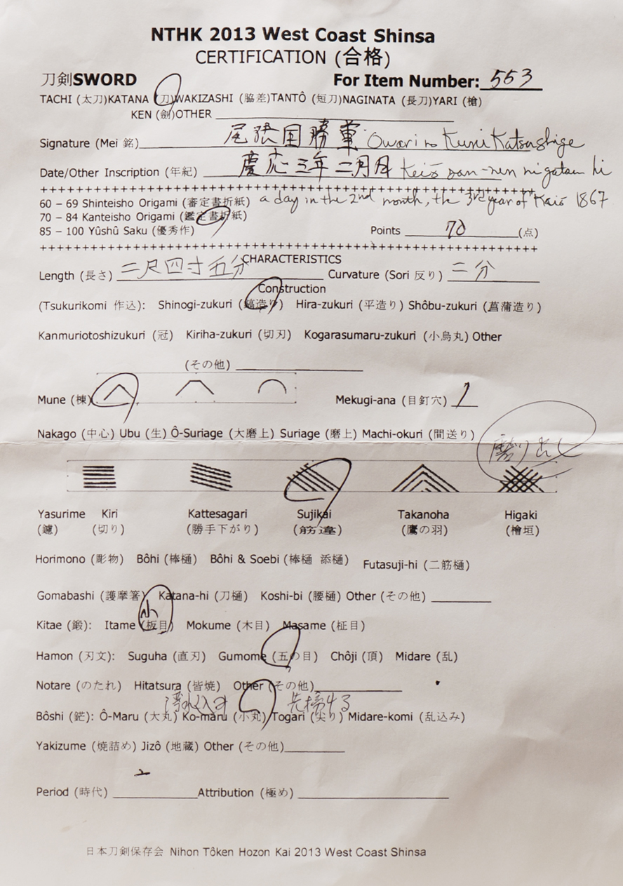 This evaluation sheet showing that this sword passed the recent shinsa held august 2013.