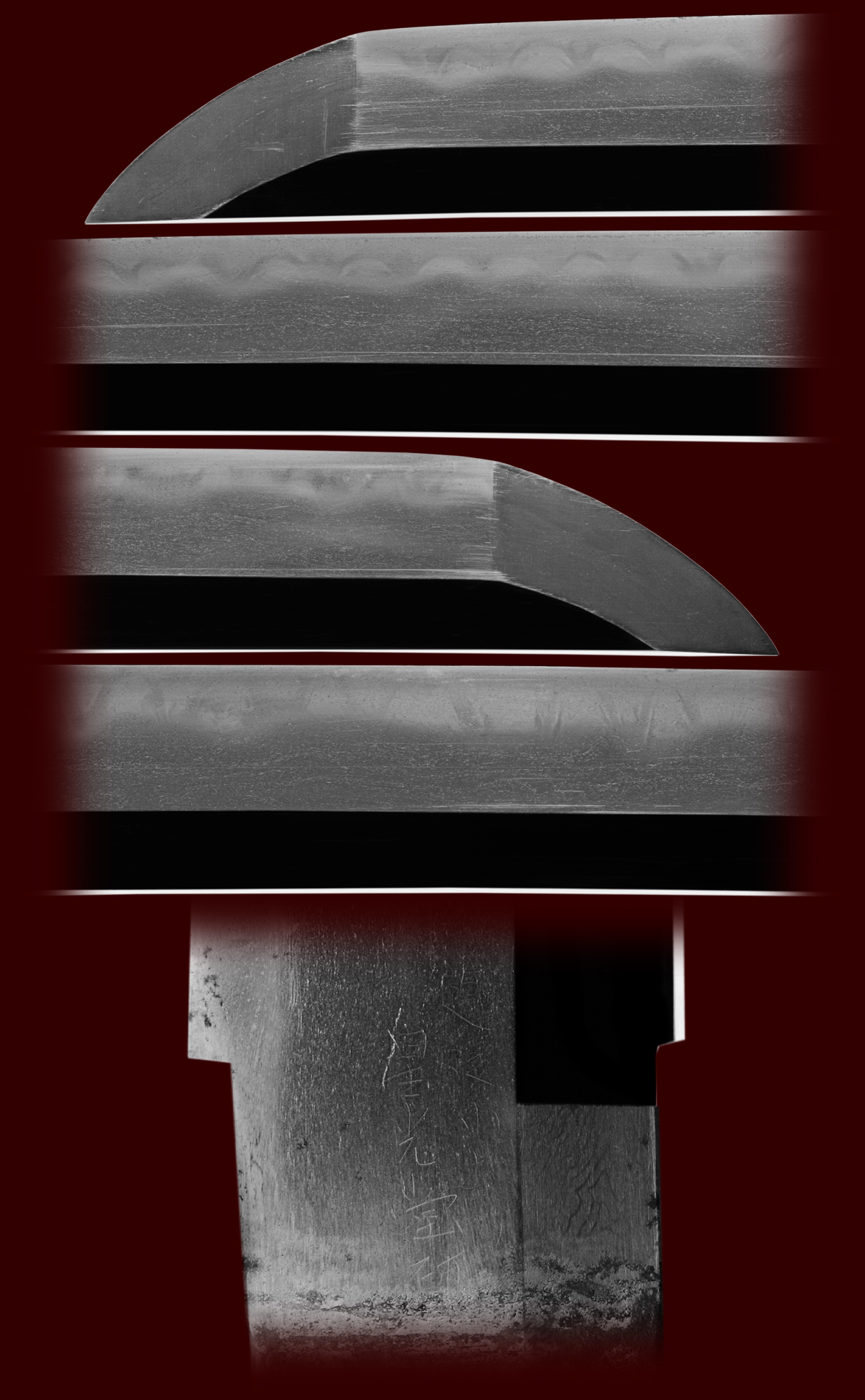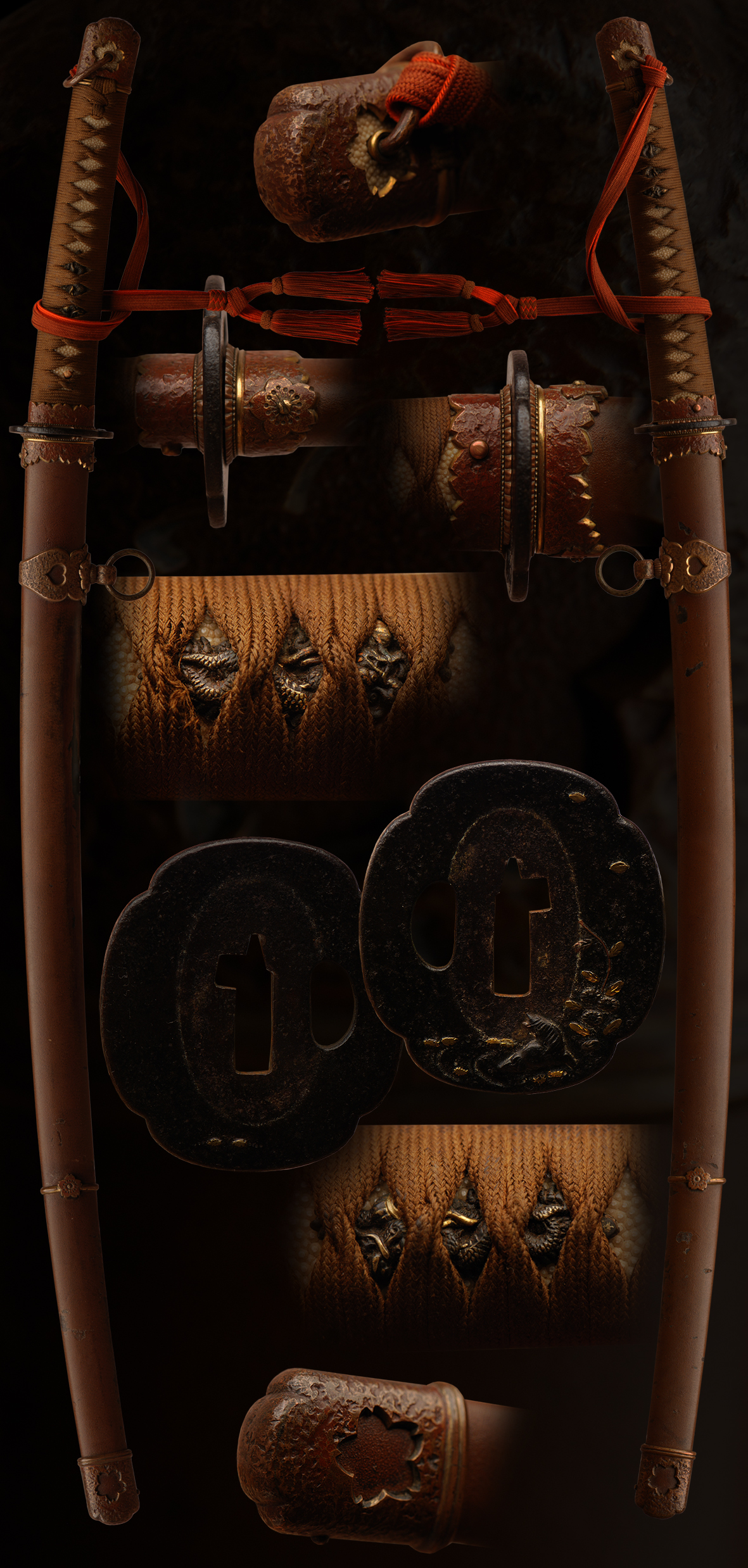 This is a very unusual military koshirai. It was obviously custom made for an officer and still even has the original tassel. These mounts are are one of a kind and truly a gem for a collector that understand the significance of this fine WWII mounts. It may be possible with more research to even trace this sword back to its original lineage. Under the habaki you can find kanji that also should be researched more. Please look at the pictures carefully to see all these details. The owner of this sword is interested in finding a proper home for this sword. We feel that this sword with these mounts stands out historically and can not be judged as just another sword in WWII koshirai. The blade and tsuba are much older than the mounts. It was common for officers that came from samurai lineage to have an ancestral blade mounted in military mounts, to take with them to modern warfare. This sword also has an older tsuba that adds to the uniqueness overall of this fine katana. The blade is of good quality and is in a good old polish. The hamon is very active but hard to photographed and looks better in hand. If this sword is to be re-polished we would recommend that extra care be placed on the kanji under the habaki. We strongly feel that it should not be removed as it adds to this swords history. We would even venture to say that this blade is a museum quality item from WWII.