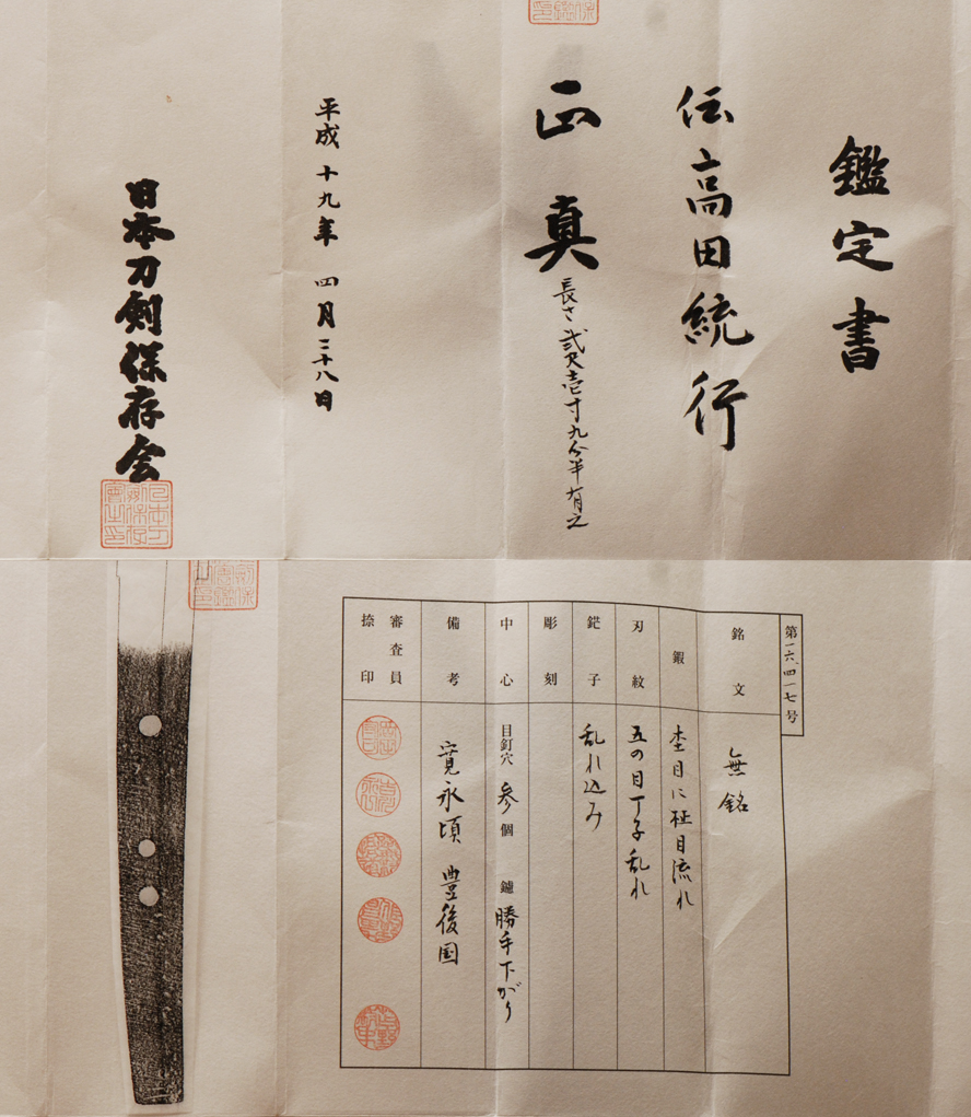 This is a very nice 1600's Takeda school Muneyuki katana. This is by the Nidai or second generation Muneyaki. The hamon has an abundance of hataraki/activity. You can find many ashi and a multitude of sunagashi throughout. The quality of this sword is very good and has a well balanced shape. It has a well forged hada in mokume/masame nagare style. Takeda school sword were very prized for being very good cutting blades. This sword comes with its mounts and a shirasaya has been made to preserve the sword in good condition. NTHK papers also come with this sword attesting to the swords age and quality also.