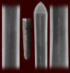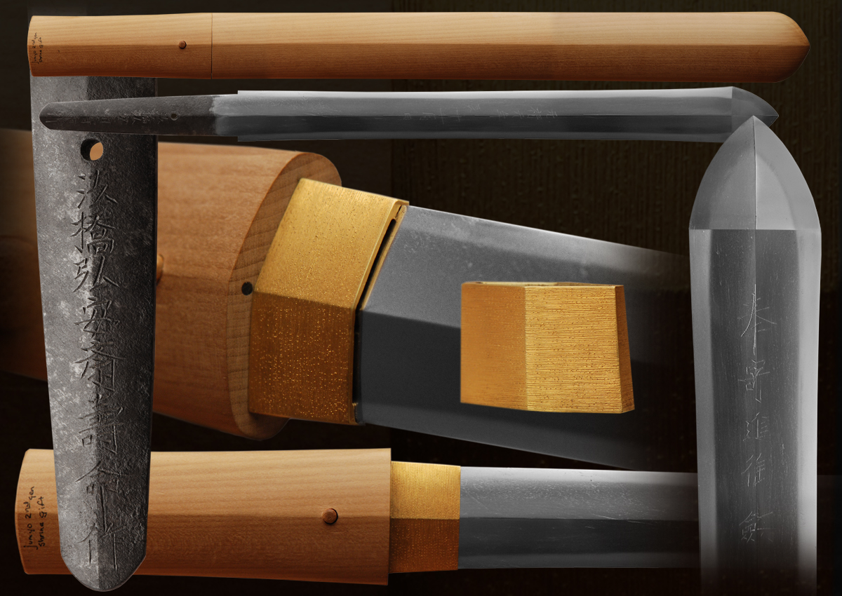 The "ken" was the original shape that was used by the first warriors and nobles in Japan. The design was copied from the Chinese and to modern times many fine Ken are still made. This blade was made by Hokyo Koansai Jumyo. Many smiths used the name of JUMYO but this smith is listed and worked in Owari province. He died in 1703 at the age of 84. Most of these types of swords were very well made as they were not so common. Many were fine presentation blade and were dedicated to shrines throughout Japan. This particular blade has a very lovely shape and balance. It is a stout and healthy blade that has a very silky hada that is well forged. The hamon is in a elegant style and not flashy. The overall look of this KEN is that of tranquility and balance. It has some lightly carved kanji on the blade. The habaki is gold foiled and comes in shirasaya with NBTHK papers attesting to the signature and quality of this fine blade.