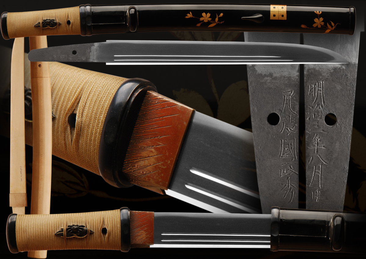 This is a wonderful tanto made by Masahide of Owari province. This blade is fully signed and dated by the smith and also has fine horimono/carvings. The hada has running masame that is forged tightly. The hamon has good hataraki/activity and is in nie deki with some nioi mixed in. This very fine tanto also comes with original mounts that add greatly to this tanto. The scabbard/saya has very lovely lacquer work and is very elegant. The handle has a silk string wrap that is also original to this blade. This is a type of mounts/koshirai that is in the best Japanese style and feels very rich. This blade comes with two sets of papers attesting to the signature and quality.